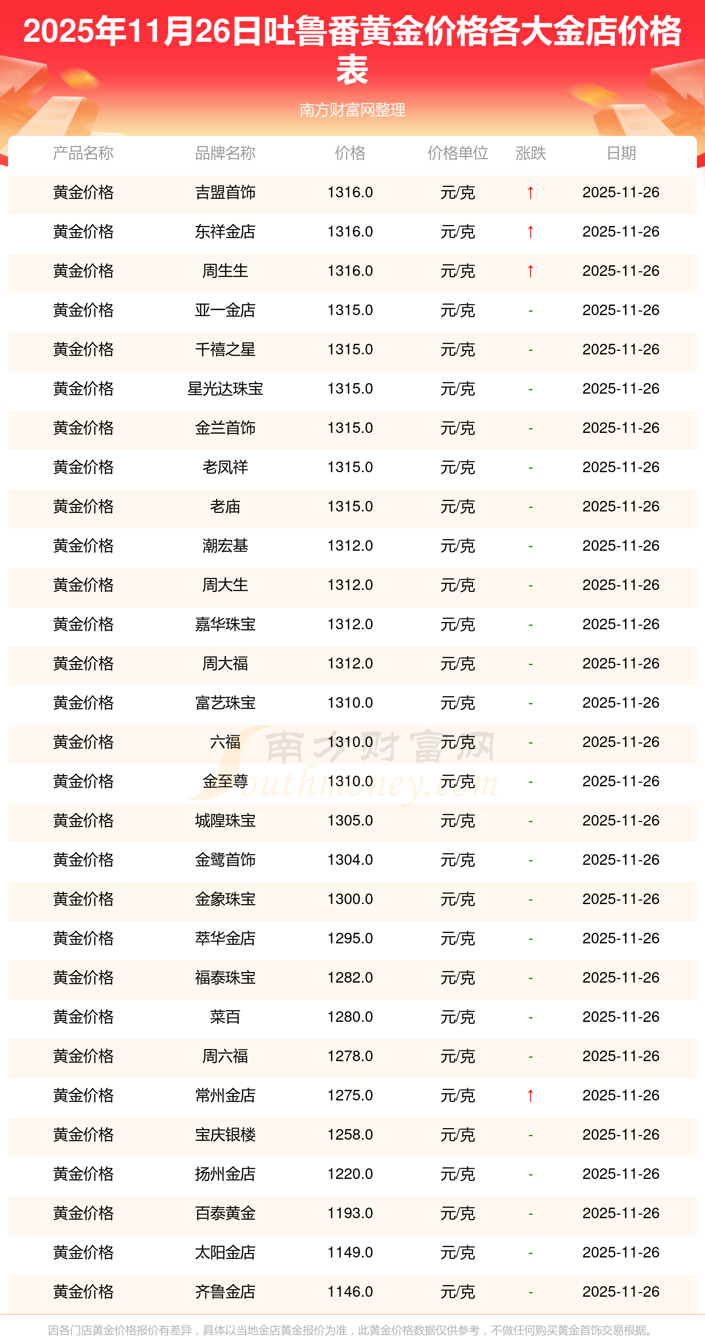 2025年11月26日,吐魯番周生生、潮宏基、潮宏基、周大生、周大生、亞一金店、亞一金店、寶慶銀樓、寶慶銀樓、太陽金店、太陽金店等各大金店品牌黃金價格今日價格行情最新來了:周生生1155.0元/克、潮宏基1312.0元/克、潮宏基624.0元/克、周大生1312.0元/克、周大生624.0元/克、亞一金店1315.0元/克、亞一金店600.0元/克、寶慶銀樓1258.0元/克、寶慶銀樓368.0元/克、太陽金店1149.0元/克、太陽金店489.0元/克。