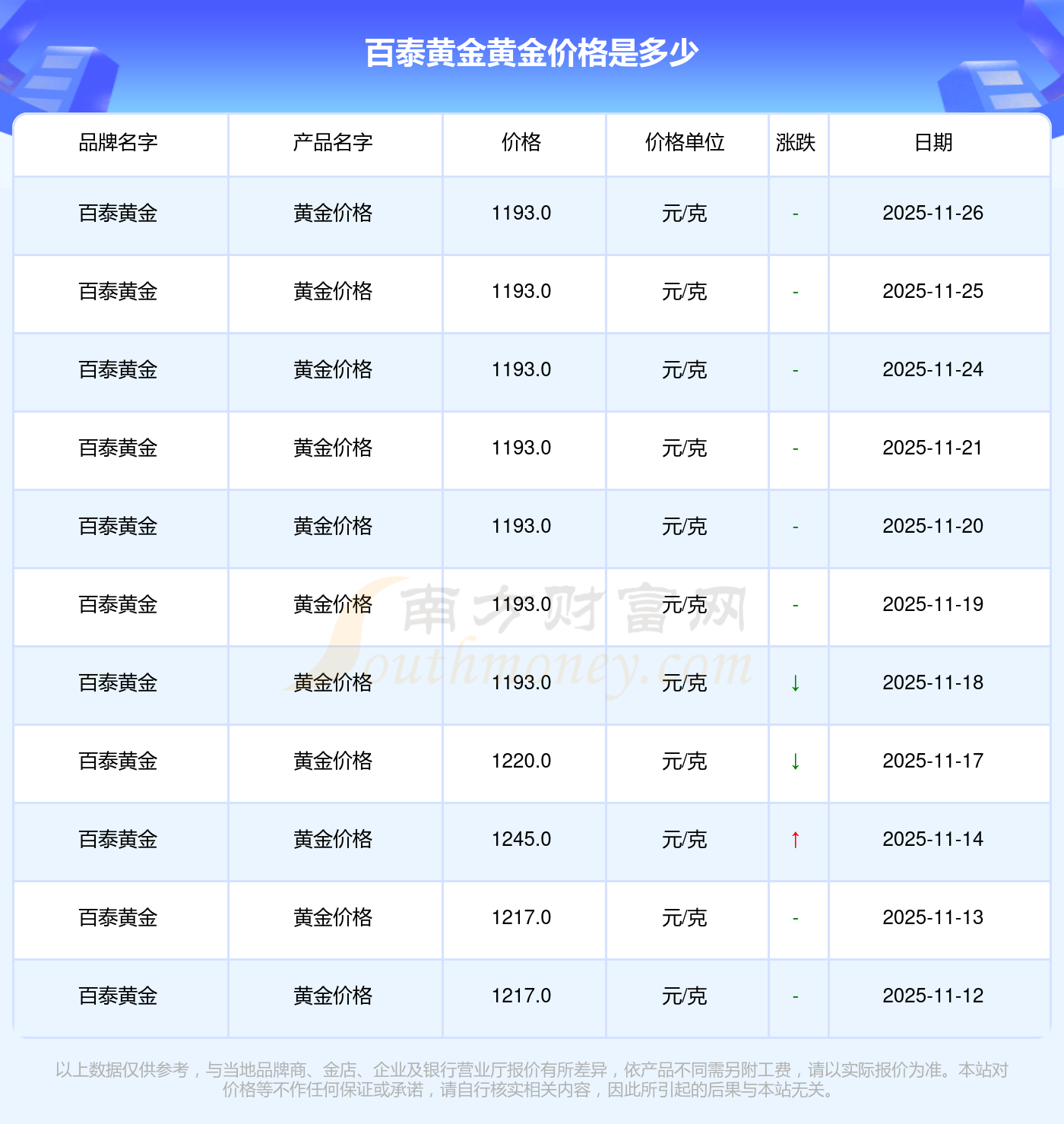 今日黃金價格是怎樣的?當下黃金一克要賣多少錢?黃金每克的價格一般而言是多少呢?1193.0元/克成為百泰黃金今日 黃金價格的最新交易的價格。