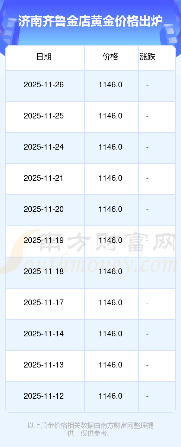 今日(2025年11月26日),濟南齊魯金店黃金價格的定價為 1146.0元/克。