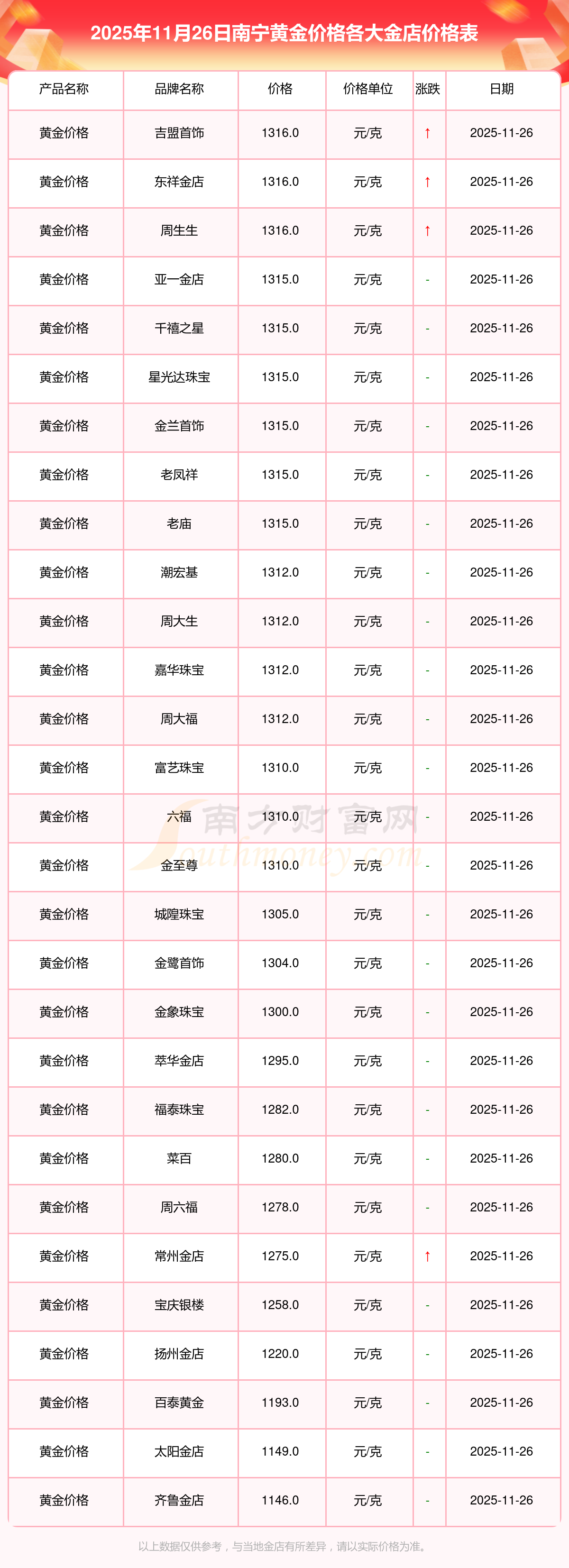 今天是2025年11月26日,南寧周生生、潮宏基、潮宏基、周大生、周大生、亞一金店、亞一金店、寶慶銀樓、寶慶銀樓、太陽金店、太陽金店等各大金店品牌黃金價(jià)格最新價(jià)格行情是這樣的:周生生1155.0元/克、潮宏基1312.0元/克、潮宏基624.0元/克、周大生1312.0元/克、周大生624.0元/克、亞一金店1315.0元/克、亞一金店600.0元/克、寶慶銀樓1258.0元/克、寶慶銀樓368.0元/克、太陽金店1149.0元/克、太陽金店489.0元/克。
