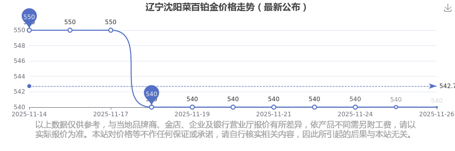 今日遼寧沈陽(yáng)菜百鉑金價(jià)格最新為:540.0元/克。