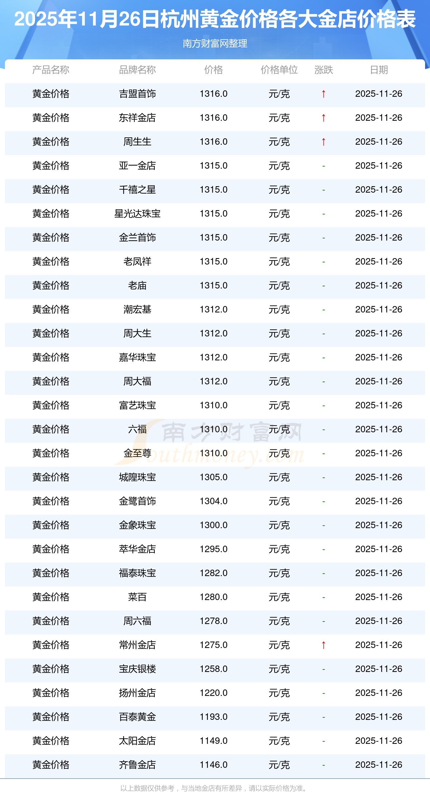 2025年11月26日,杭州周生生、潮宏基、潮宏基、周大生、周大生、亞一金店、亞一金店、寶慶銀樓、寶慶銀樓、太陽(yáng)金店、太陽(yáng)金店等各大金店品牌黃金價(jià)格今日價(jià)格如下:周生生1155.0元/克、潮宏基1312.0元/克、潮宏基624.0元/克、周大生1312.0元/克、周大生624.0元/克、亞一金店1315.0元/克、亞一金店600.0元/克、寶慶銀樓1258.0元/克、寶慶銀樓368.0元/克、太陽(yáng)金店1149.0元/克、太陽(yáng)金店489.0元/克。