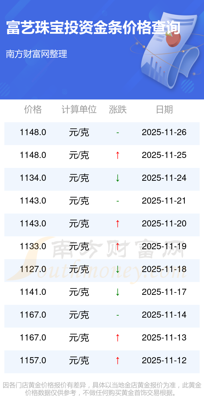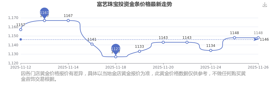 富藝珠寶今日投資金條的最新市場(chǎng)行情價(jià)為1148.0元/克。