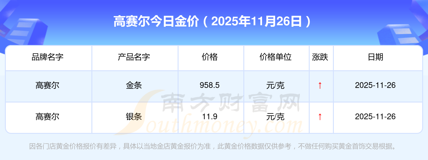 2025年11月26日高賽爾最新價格:金條金價(內(nèi)地)1155.0元/克,黃金價格1312.0元/克,鉑金價格624.0元/克,黃金價格1312.0元/克,鉑金價格624.0元/克,黃金價格1315.0元/克,鉑金價格600.0元/克,黃金價格1258.0元/克,鉑金價格368.0元/克,黃金價格1149.0元/克,鉑金價格489.0元/克。