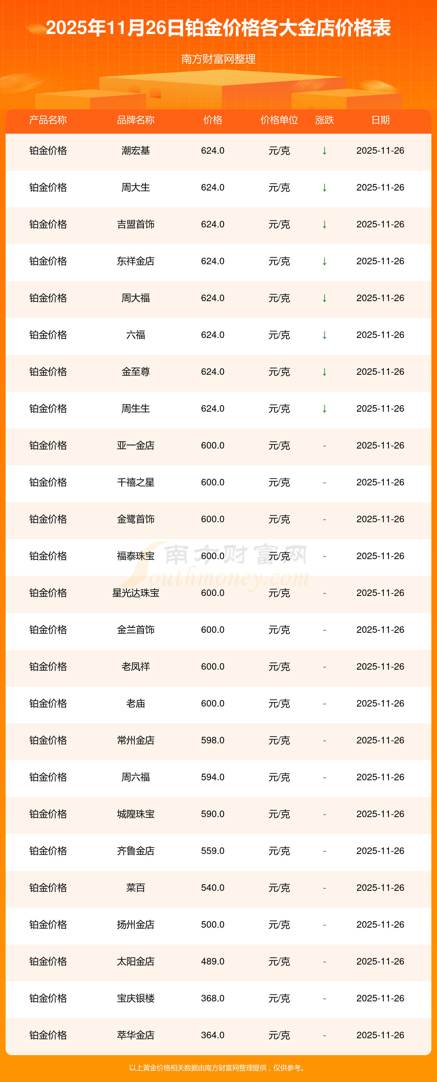 2025年11月26日各大金店鉑金價(jià)格最新價(jià)格:周生生1155.0元/克,潮宏基1312.0元/克,潮宏基624.0元/克,周大生1312.0元/克,周大生624.0元/克,亞一金店1315.0元/克,亞一金店600.0元/克,寶慶銀樓1258.0元/克,寶慶銀樓368.0元/克,太陽(yáng)金店1149.0元/克,太陽(yáng)金店489.0元/克。