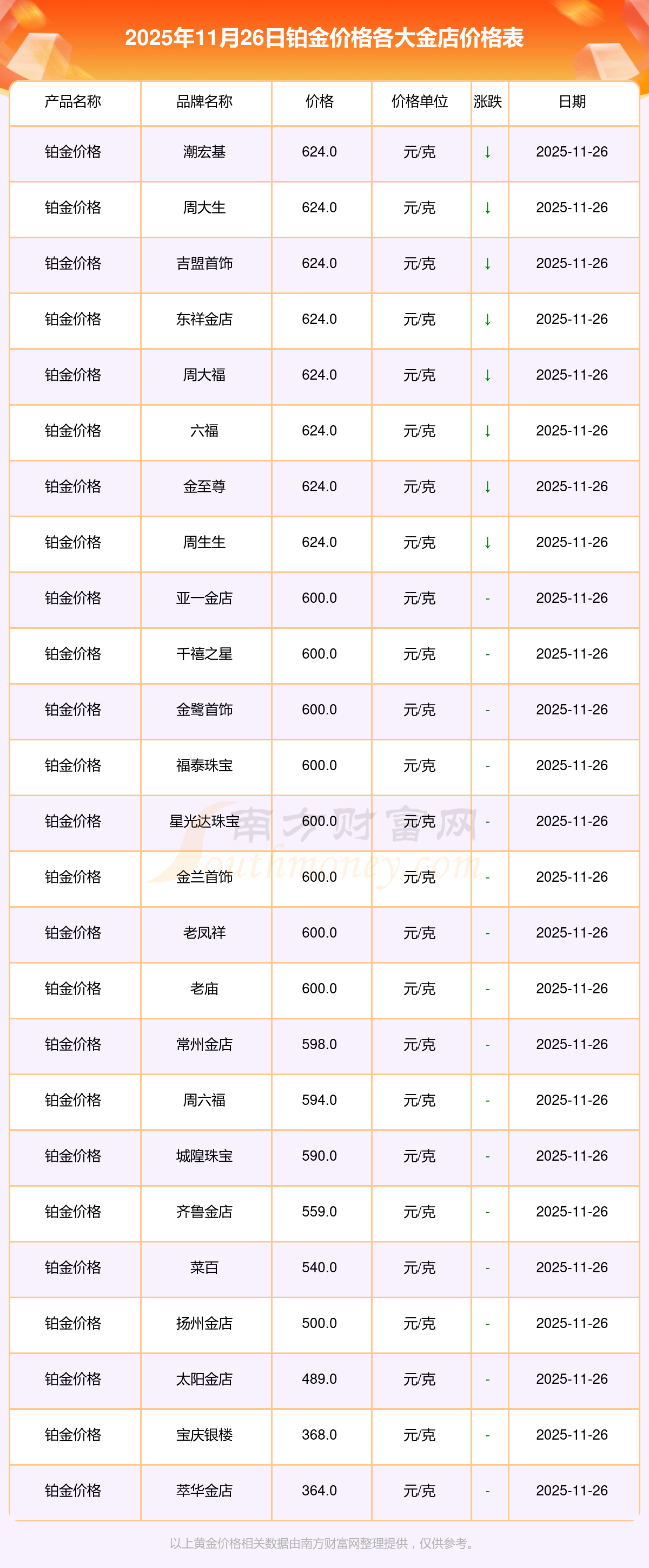 今天是2025年11月26日,周生生、潮宏基、潮宏基、周大生、周大生、亞一金店、亞一金店、寶慶銀樓、寶慶銀樓、太陽金店、太陽金店等各大金店品牌鉑金價格最新價格如下:周生生1155.0元/克、潮宏基1312.0元/克、潮宏基624.0元/克、周大生1312.0元/克、周大生624.0元/克、亞一金店1315.0元/克、亞一金店600.0元/克、寶慶銀樓1258.0元/克、寶慶銀樓368.0元/克、太陽金店1149.0元/克、太陽金店489.0元/克。