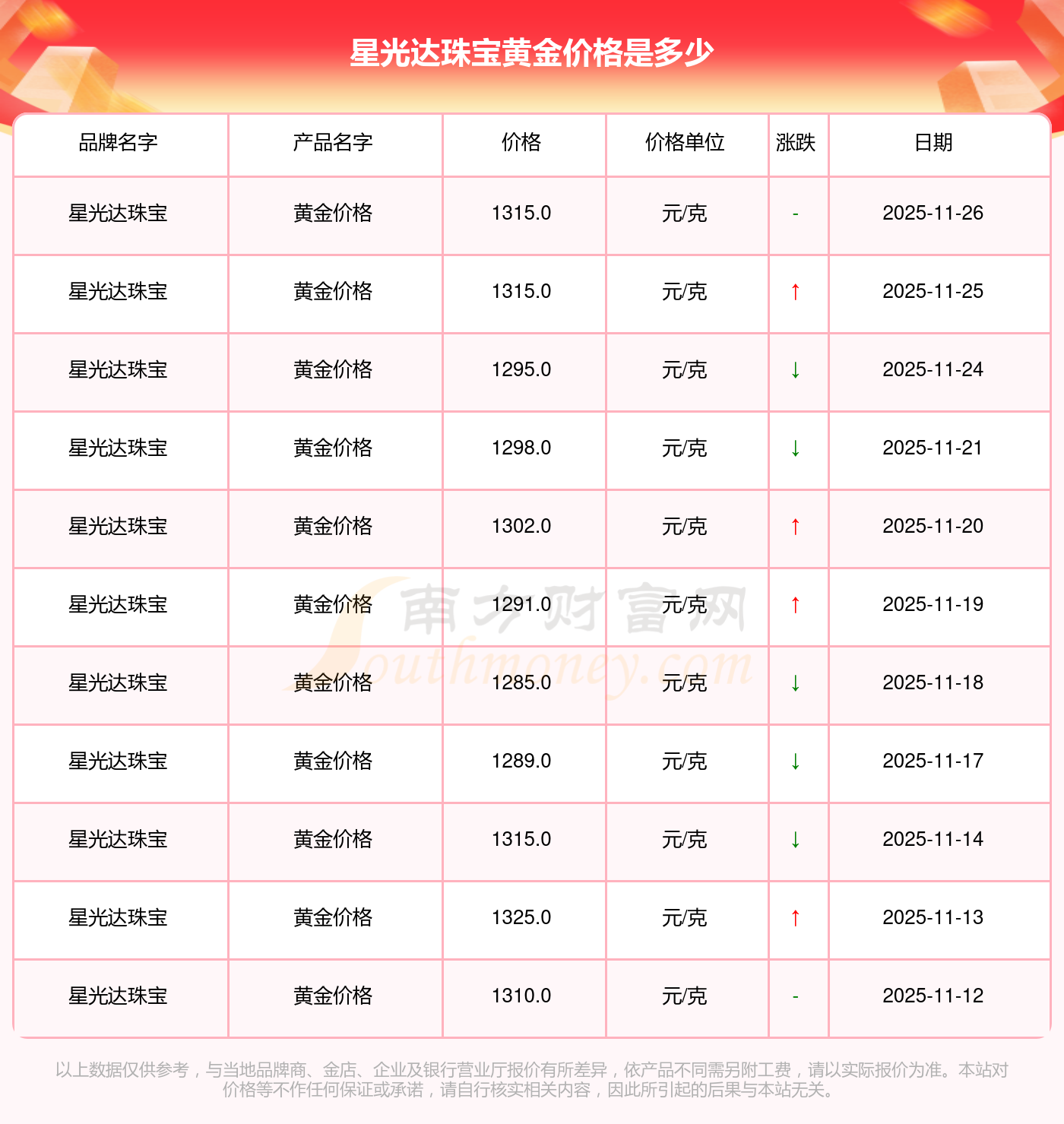 今日黃金價格查詢_現(xiàn)在金價黃金一克多少錢,黃金價格是多少錢一克?一般情況下黃金每克的價位是多少左右?今日星光達珠寶黃金價格為1315.0元/克。