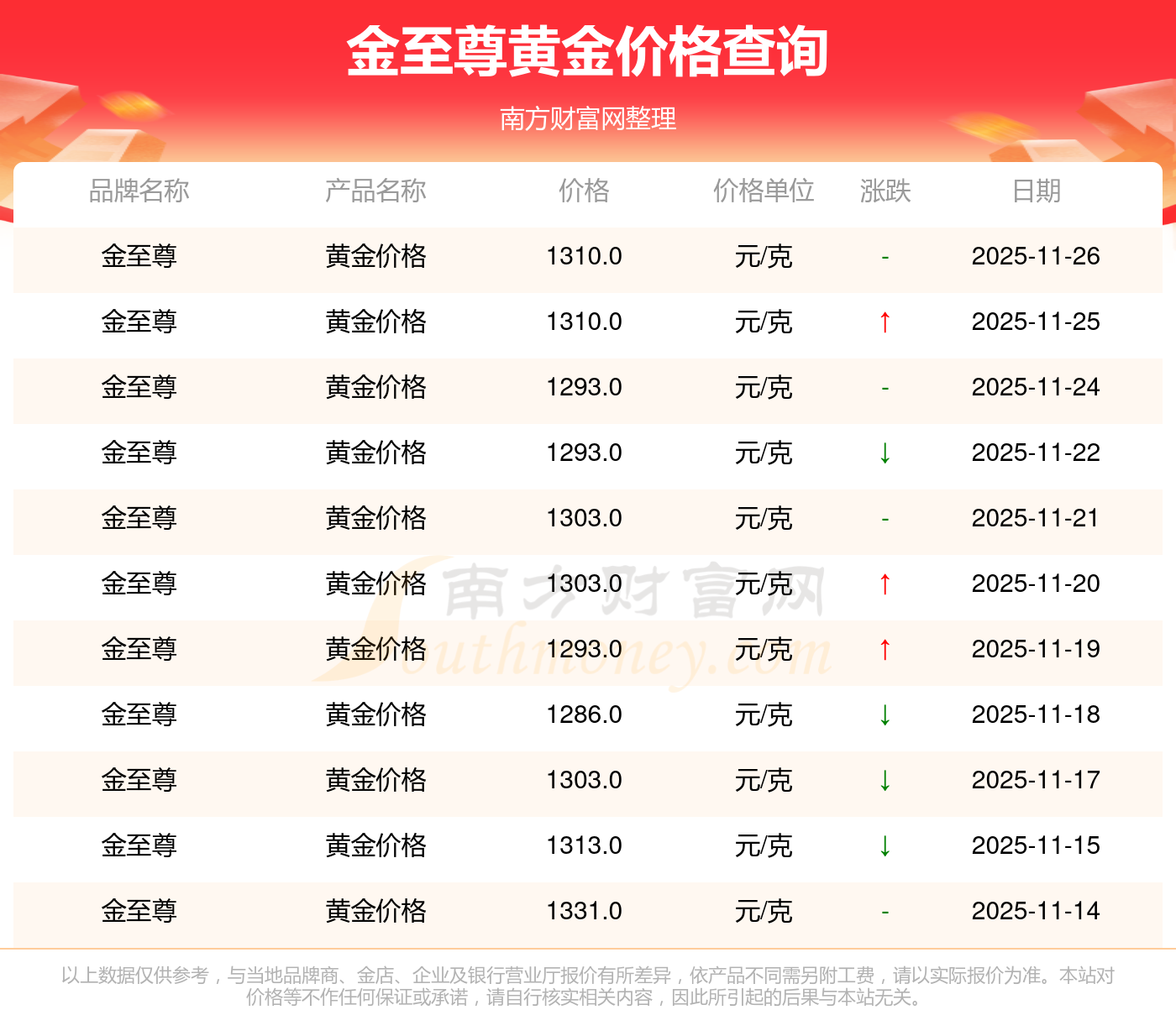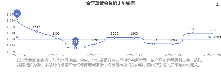 最新數(shù)據(jù)表明,金至尊今日 黃金價格為1310.0元/克。