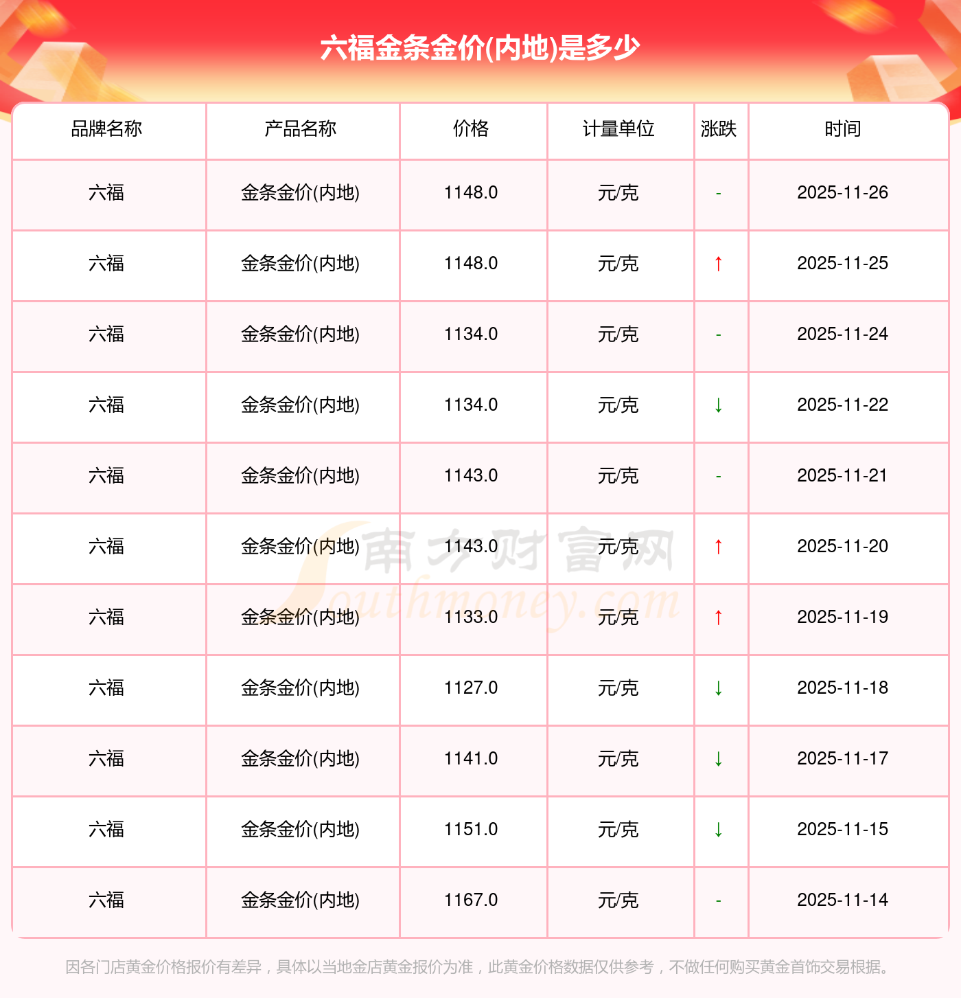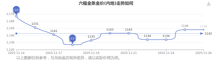 今日(2025年11月26日),六福金條金價(jià)(內(nèi)地)最新價(jià)格是1148.0元/克。