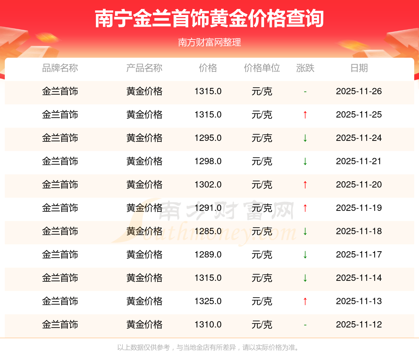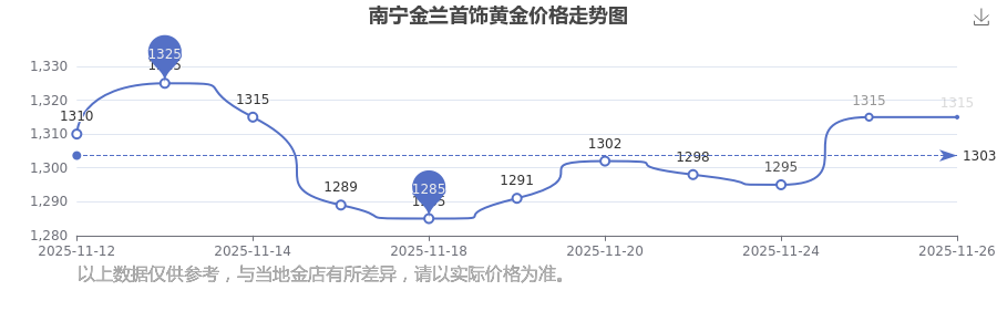 (2025年11月26日)今日南寧金蘭首飾黃金價格是1315.0元/克。