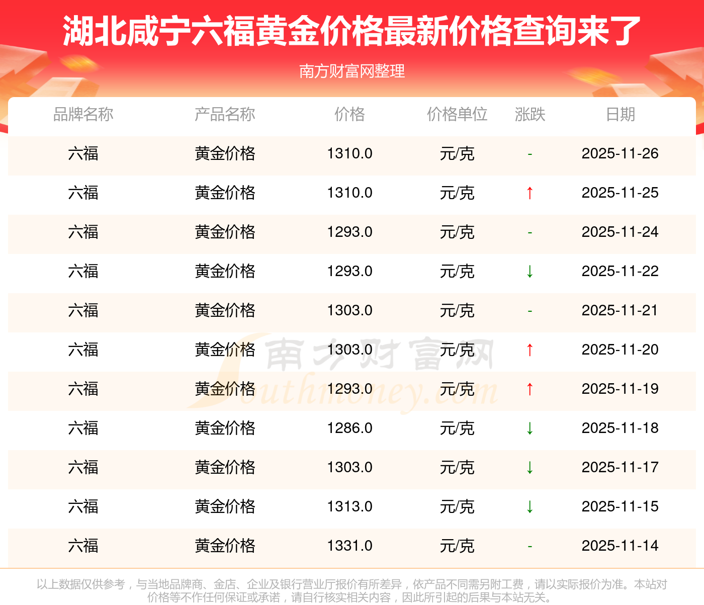 今日湖北咸寧六福黃金價(jià)格公布黃金價(jià)格今天多少一克湖北咸寧六福的黃金價(jià)格在今日(2025年11月26日),每克售價(jià)為1310.0元/克。