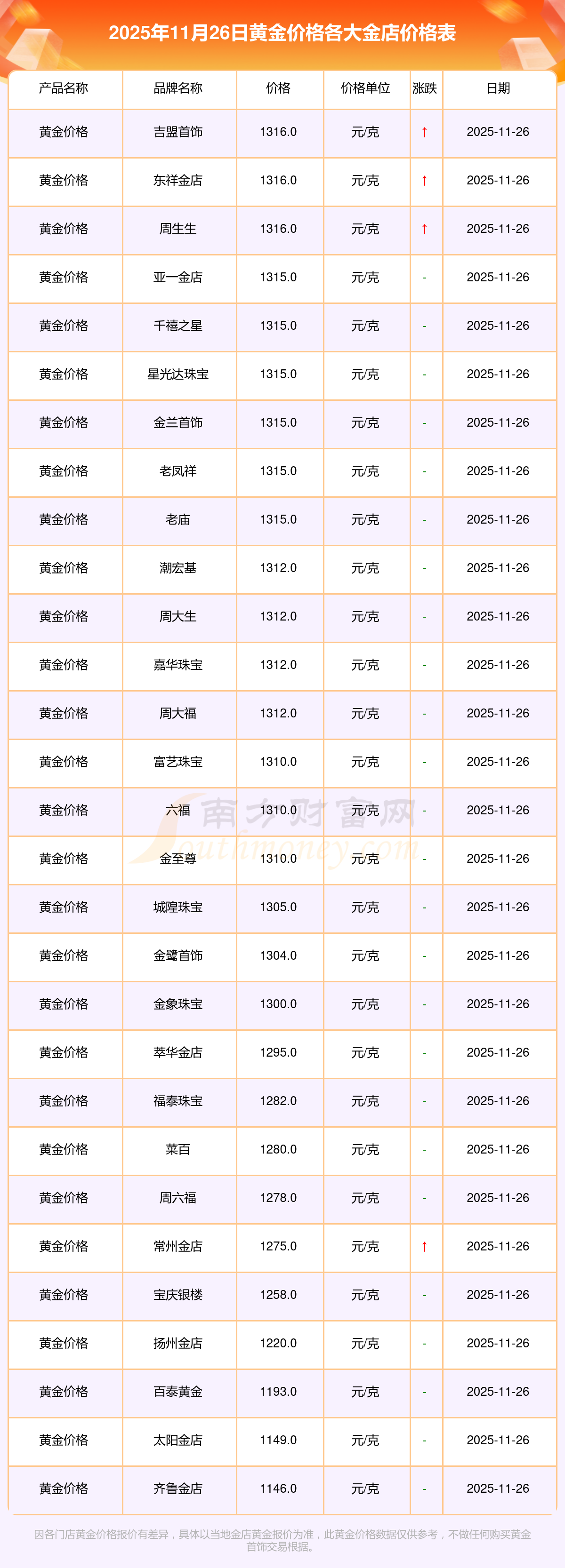 2025年11月26日各大金店黃金價(jià)格多少一克?各大金店黃金價(jià)格報(bào)價(jià)表詳情,每家金店的黃金價(jià)格之所以不一樣,黃金基礎(chǔ)價(jià)格是由國(guó)際黃金市場(chǎng)的供求關(guān)系和價(jià)格波動(dòng)所定的。金店會(huì)根據(jù)國(guó)際金價(jià)的變化來(lái)制定和調(diào)整金飾的價(jià)格。接下來(lái)隨小編來(lái)看看今日市場(chǎng)行情。