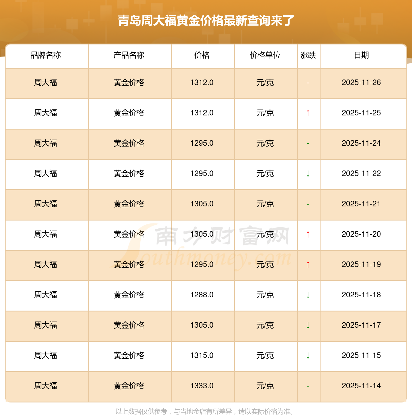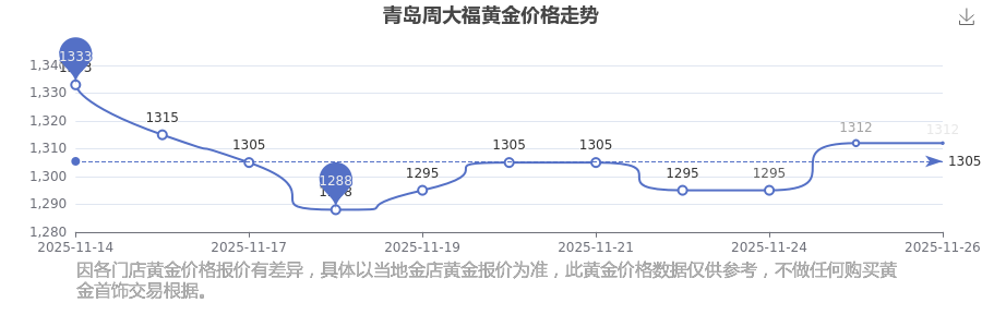 今日青島周大福黃金價(jià)格查詢,2025年11月26日,今日青島周大福黃金價(jià)格:1312.0元/克。