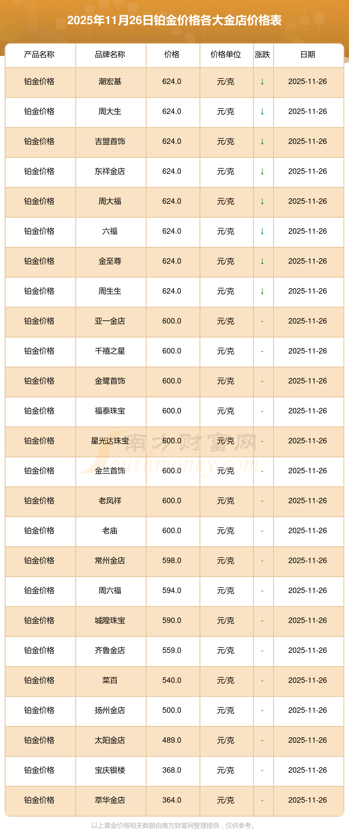 2025年11月26日,周生生、潮宏基、潮宏基、周大生、周大生、亞一金店、亞一金店、寶慶銀樓、寶慶銀樓、太陽金店、太陽金店等各大金店品牌鉑金價格今日價格如下:周生生1155.0元/克、潮宏基1312.0元/克、潮宏基624.0元/克、周大生1312.0元/克、周大生624.0元/克、亞一金店1315.0元/克、亞一金店600.0元/克、寶慶銀樓1258.0元/克、寶慶銀樓368.0元/克、太陽金店1149.0元/克、太陽金店489.0元/克。