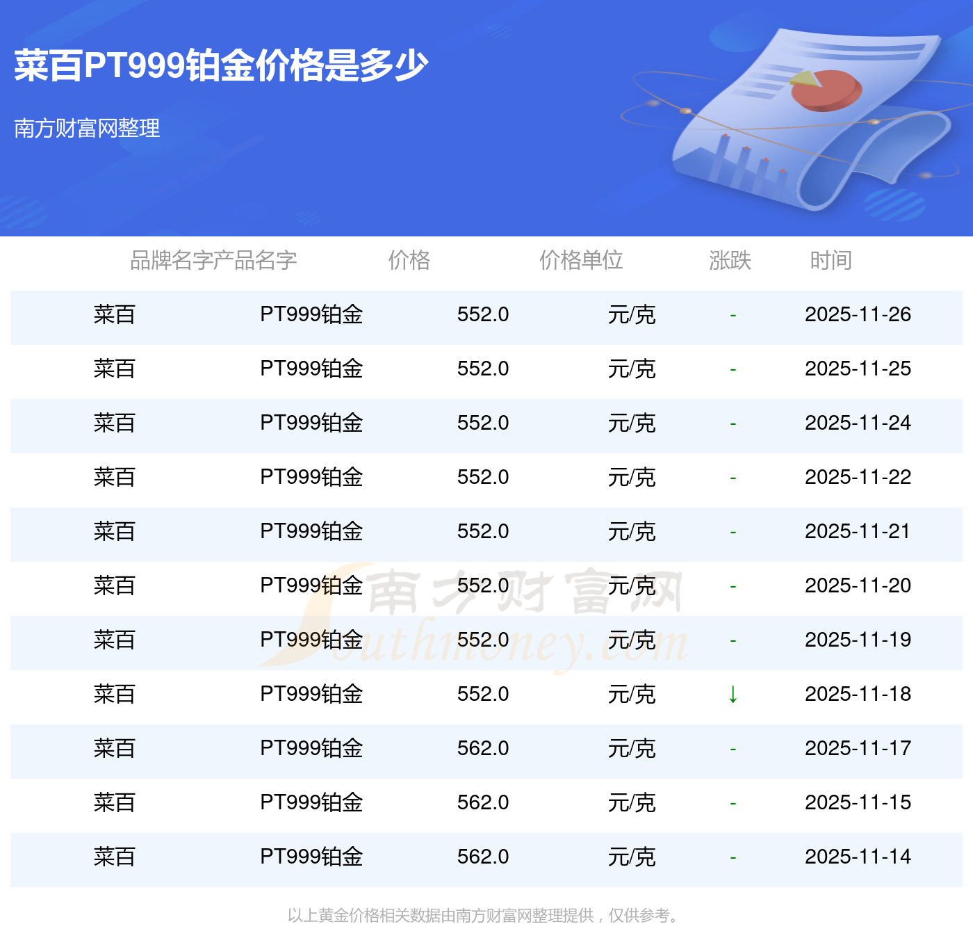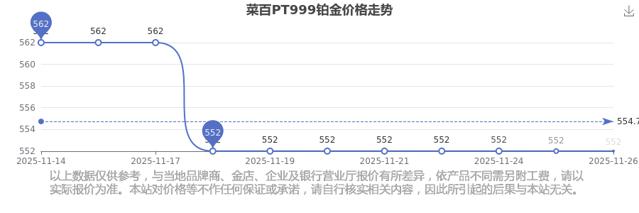 今日菜百 PT999鉑金最新的市場標(biāo)價為552.0元/克。