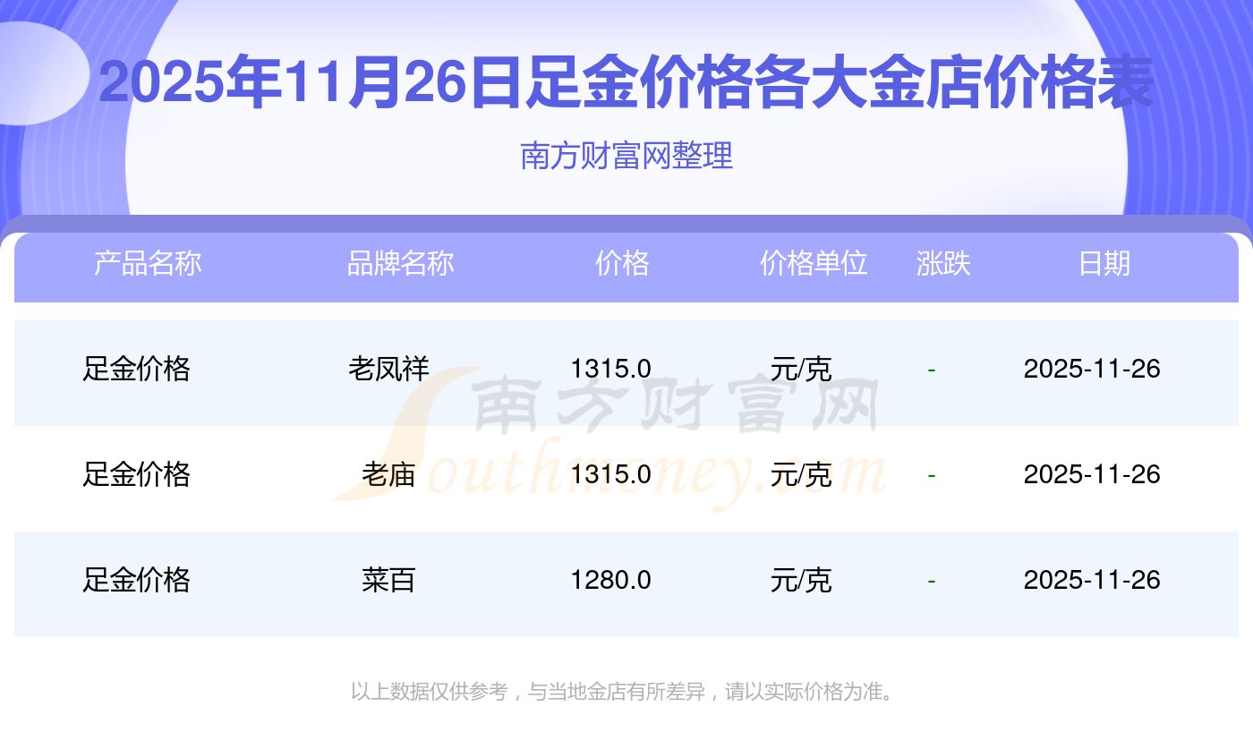 今天是2025年11月26日,周生生、潮宏基、潮宏基、周大生、周大生、亞一金店、亞一金店、寶慶銀樓、寶慶銀樓、太陽(yáng)金店、太陽(yáng)金店等各大金店品牌足金價(jià)格最新價(jià)格如下:周生生1155.0元/克、潮宏基1312.0元/克、潮宏基624.0元/克、周大生1312.0元/克、周大生624.0元/克、亞一金店1315.0元/克、亞一金店600.0元/克、寶慶銀樓1258.0元/克、寶慶銀樓368.0元/克、太陽(yáng)金店1149.0元/克、太陽(yáng)金店489.0元/克。