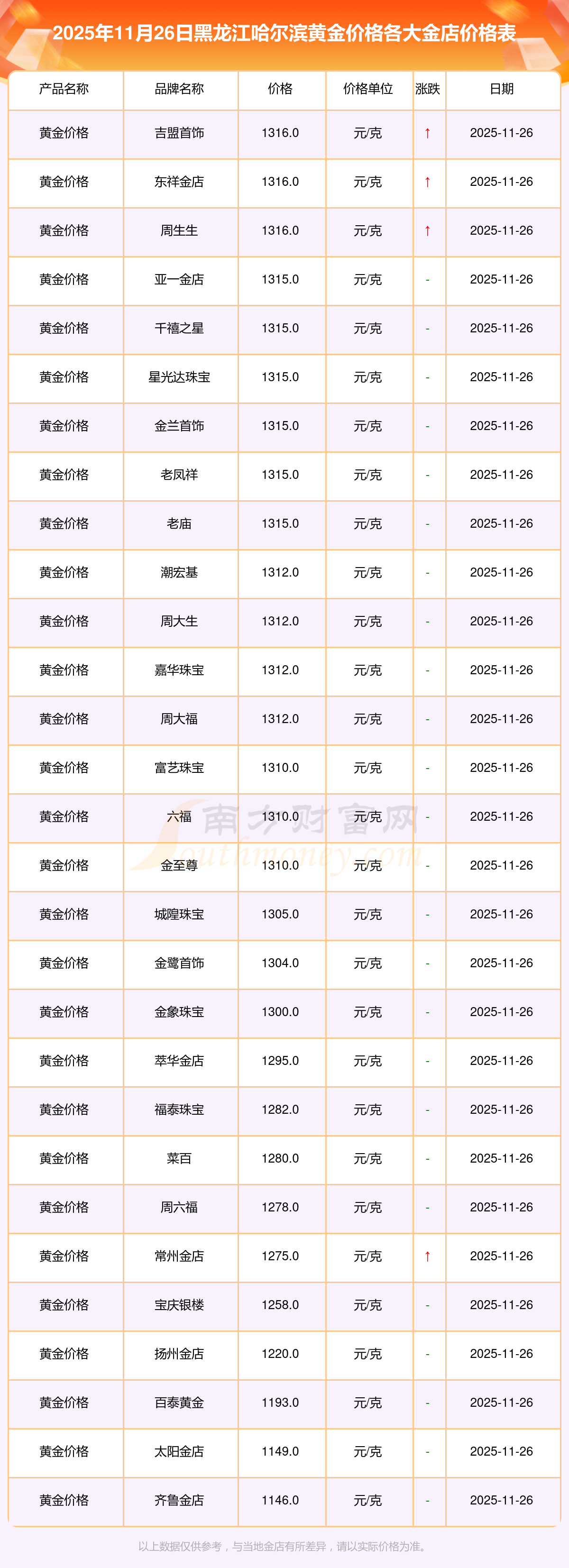 2025年11月26日黑龍江哈爾濱各大金店黃金價(jià)格最新價(jià)格查詢來了:周生生1155.0元/克,潮宏基1312.0元/克,潮宏基624.0元/克,周大生1312.0元/克,周大生624.0元/克,亞一金店1315.0元/克,亞一金店600.0元/克,寶慶銀樓1258.0元/克,寶慶銀樓368.0元/克,太陽金店1149.0元/克,太陽金店489.0元/克。