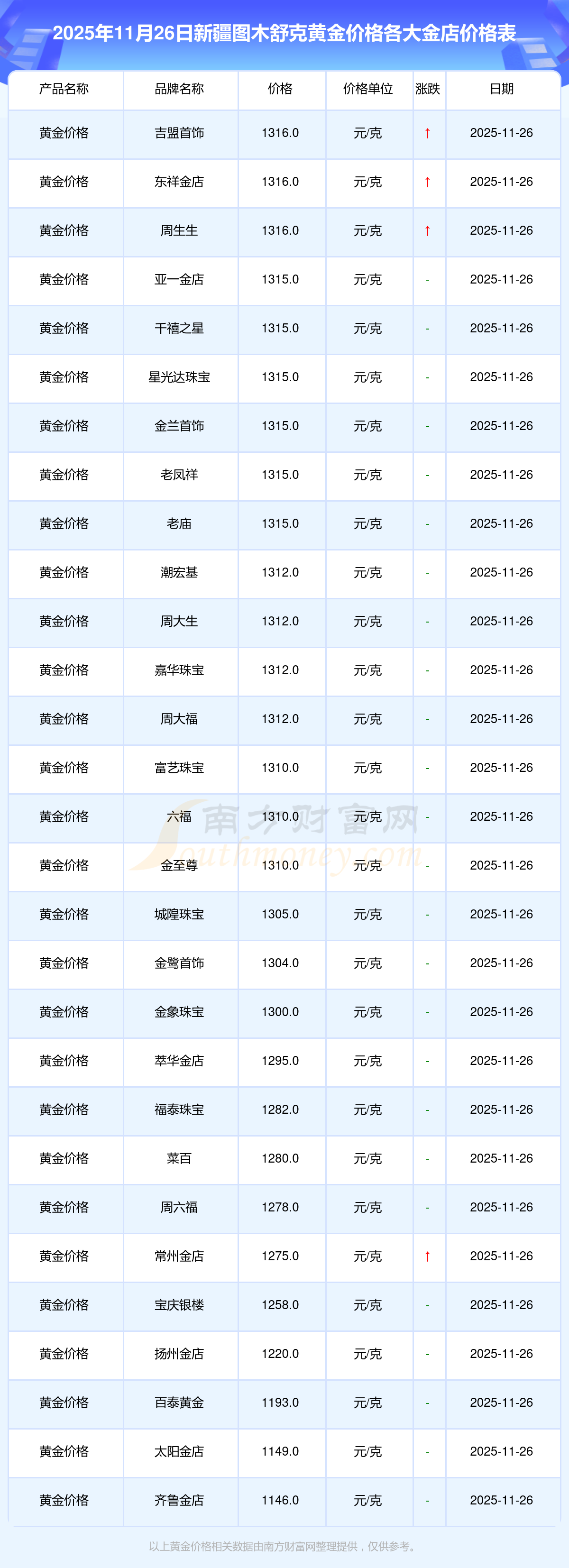 今天是2025年11月26日,新疆圖木舒克周生生、潮宏基、潮宏基、周大生、周大生、亞一金店、亞一金店、寶慶銀樓、寶慶銀樓、太陽金店、太陽金店等各大金店品牌黃金價格最新價格行情是這樣的:周生生1155.0元/克、潮宏基1312.0元/克、潮宏基624.0元/克、周大生1312.0元/克、周大生624.0元/克、亞一金店1315.0元/克、亞一金店600.0元/克、寶慶銀樓1258.0元/克、寶慶銀樓368.0元/克、太陽金店1149.0元/克、太陽金店489.0元/克。