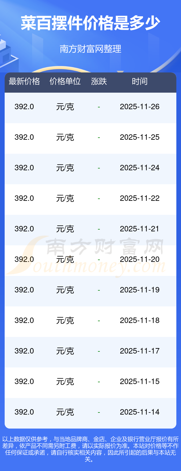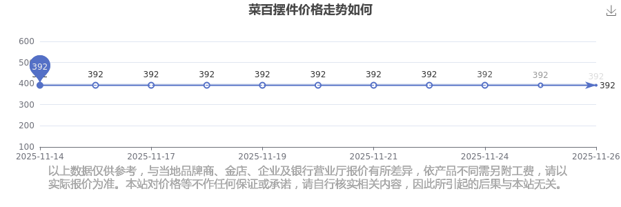 菜百 擺件價(jià)格在今日的最新價(jià)格顯示為392.0元/克。