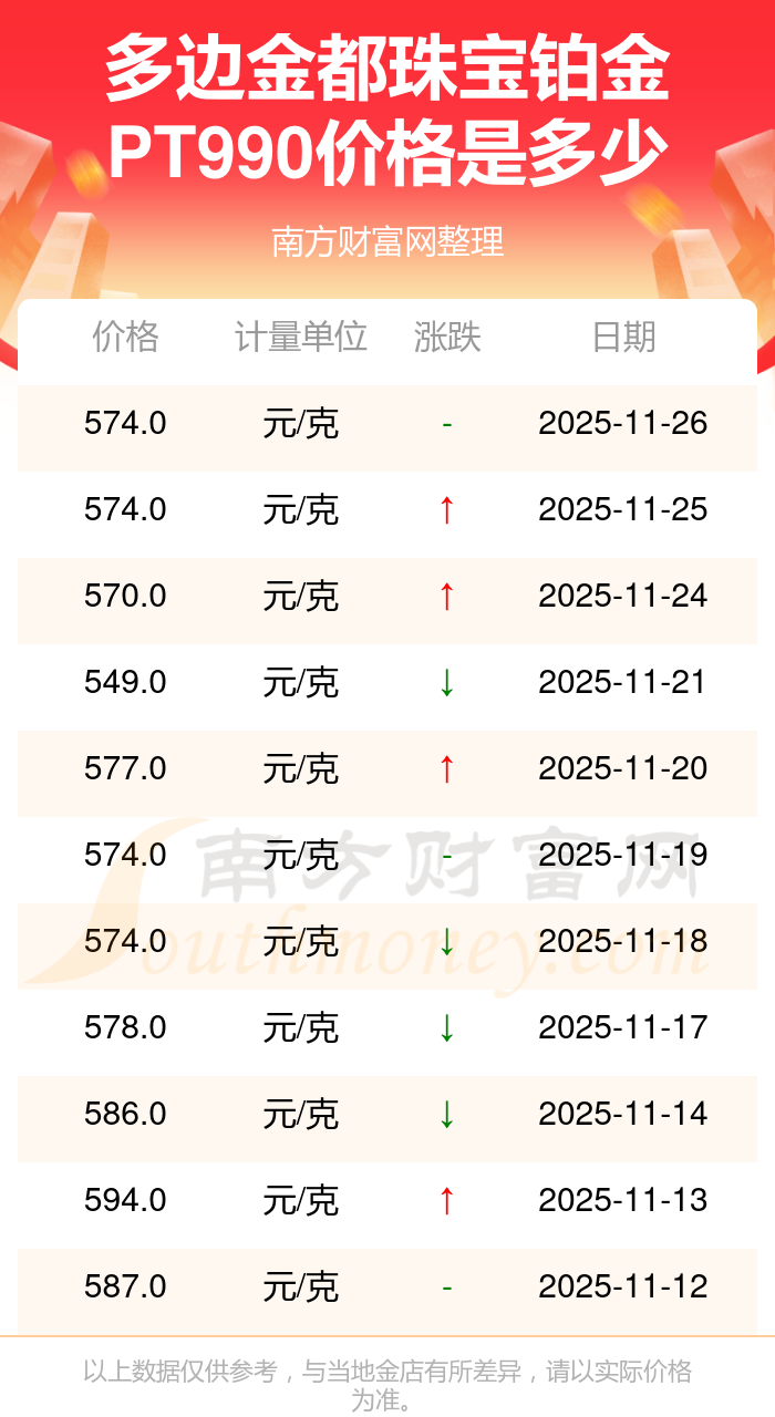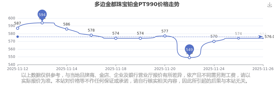 今日(2025年11月26日),多邊金都珠寶鉑金PT990價(jià)格:574.0元/克。