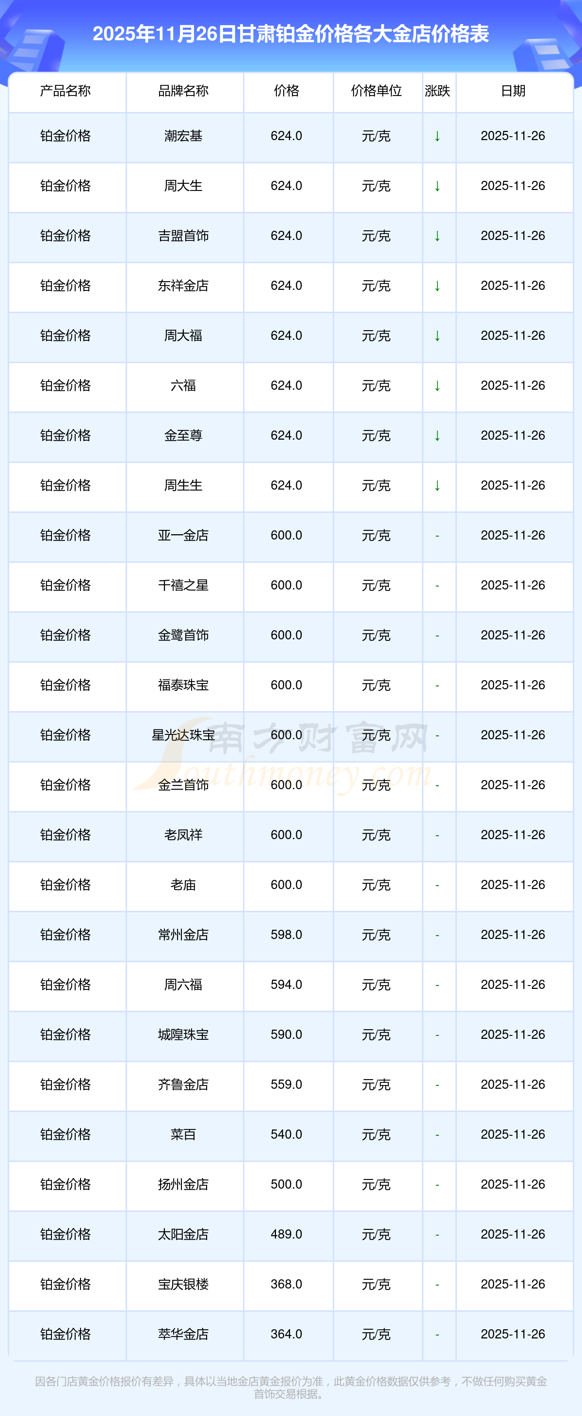 2025年11月26日甘肅各大金店鉑金價(jià)格最新價(jià)格:周生生1155.0元/克,潮宏基1312.0元/克,潮宏基624.0元/克,周大生1312.0元/克,周大生624.0元/克,亞一金店1315.0元/克,亞一金店600.0元/克,寶慶銀樓1258.0元/克,寶慶銀樓368.0元/克,太陽金店1149.0元/克,太陽金店489.0元/克。