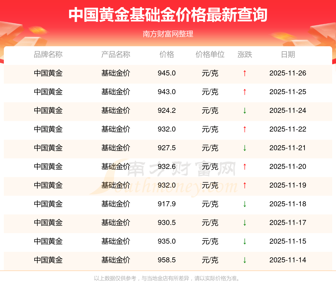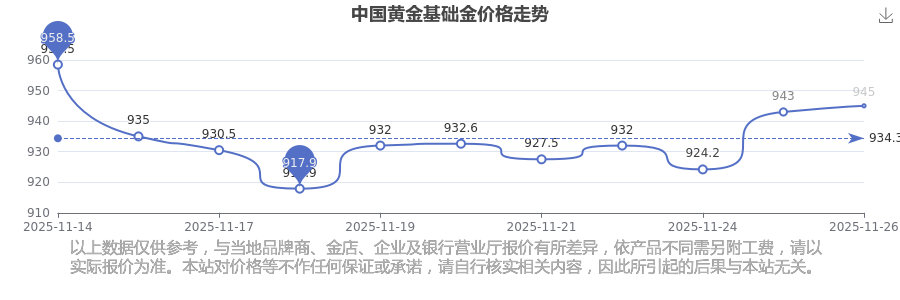 目前中國黃金 基礎(chǔ)金價的價格,今日最新為945.0元/克。