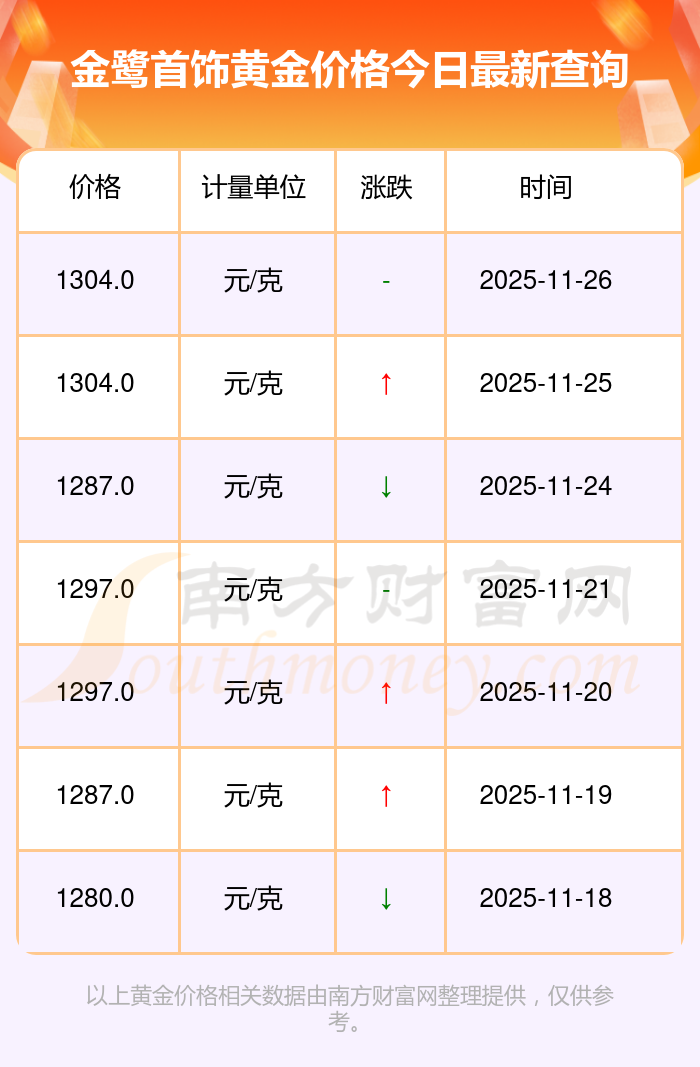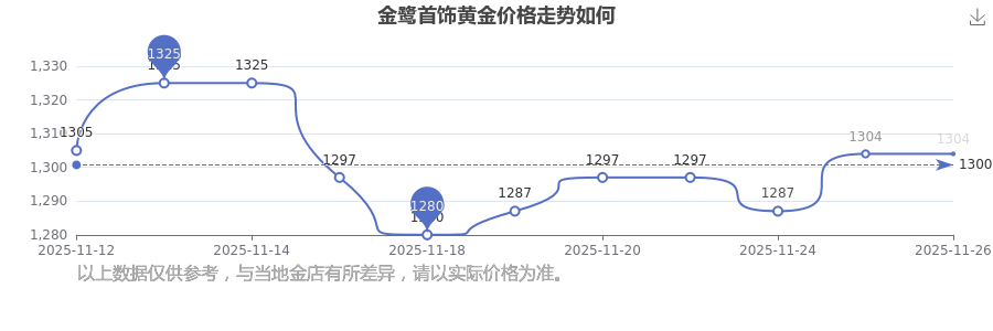金鷺首飾 黃金價格在今日更新至1304.0元/克。