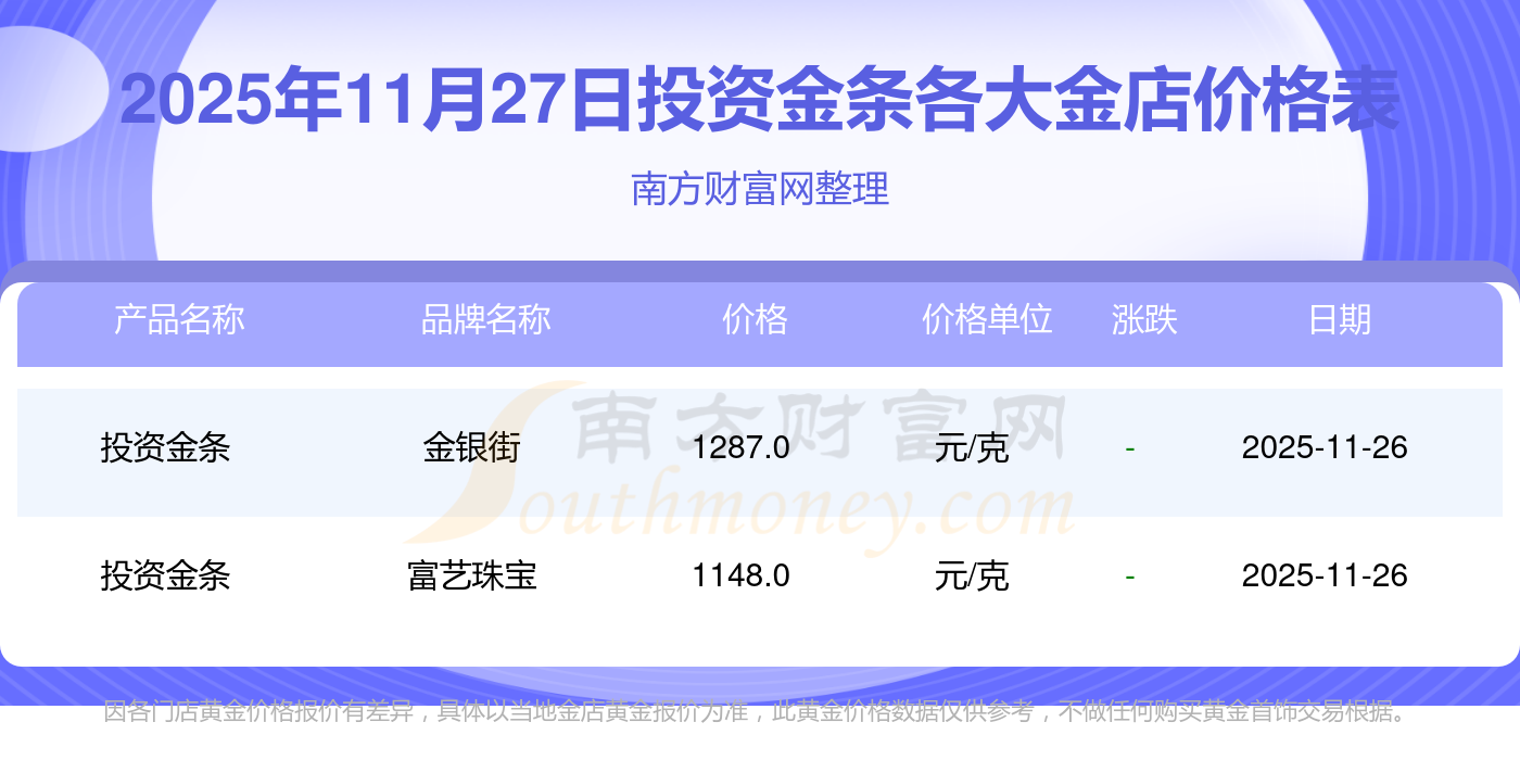 2025年11月27日各大金店投資金條最新價格:周生生1155.0元/克,潮宏基1312.0元/克,潮宏基624.0元/克,周大生1312.0元/克,周大生624.0元/克,亞一金店1315.0元/克,亞一金店600.0元/克,寶慶銀樓1258.0元/克,寶慶銀樓368.0元/克,太陽金店1149.0元/克,太陽金店489.0元/克。