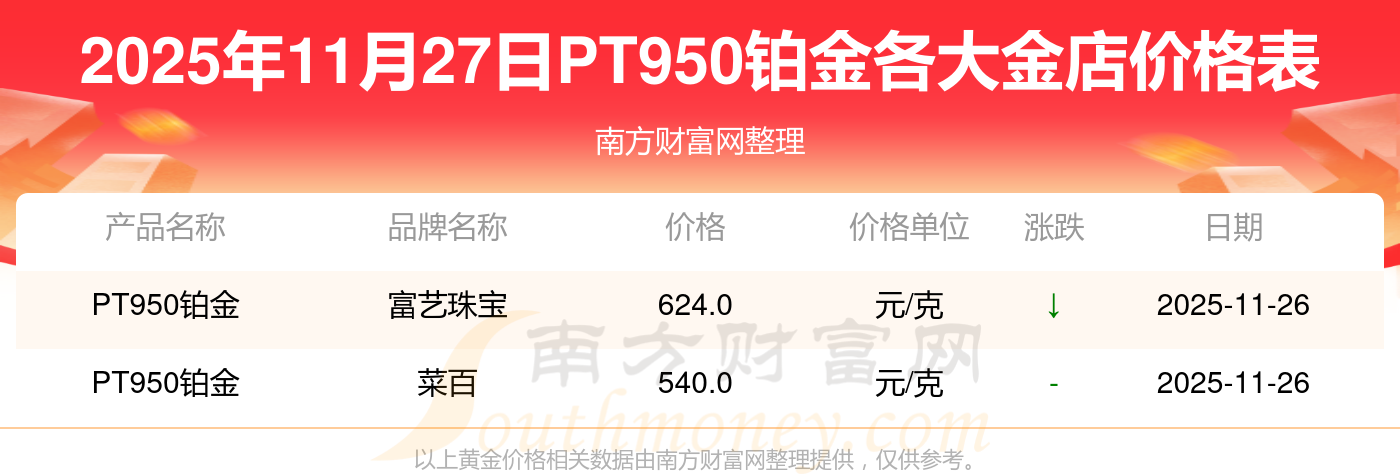 2025年11月27日各大金店P(guān)T950鉑金最新價(jià)格:周生生1155.0元/克,潮宏基1312.0元/克,潮宏基624.0元/克,周大生1312.0元/克,周大生624.0元/克,亞一金店1315.0元/克,亞一金店600.0元/克,寶慶銀樓1258.0元/克,寶慶銀樓368.0元/克,太陽金店1149.0元/克,太陽金店489.0元/克。