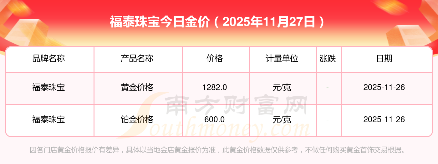 福泰珠寶現(xiàn)在金價多少錢一克?福泰珠寶今天黃金價格多少一克?最新福泰珠寶查詢,2025年11月27日福泰珠寶黃金價格現(xiàn)在每克多少錢?最新福泰珠寶黃金價格報價公布,一起來看看吧!