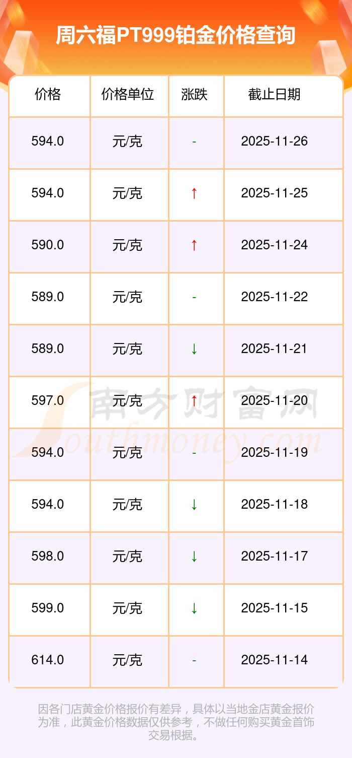 周六福今日PT999鉑金價(jià)格的最新市場(chǎng)行情價(jià)為594.0元/克。
