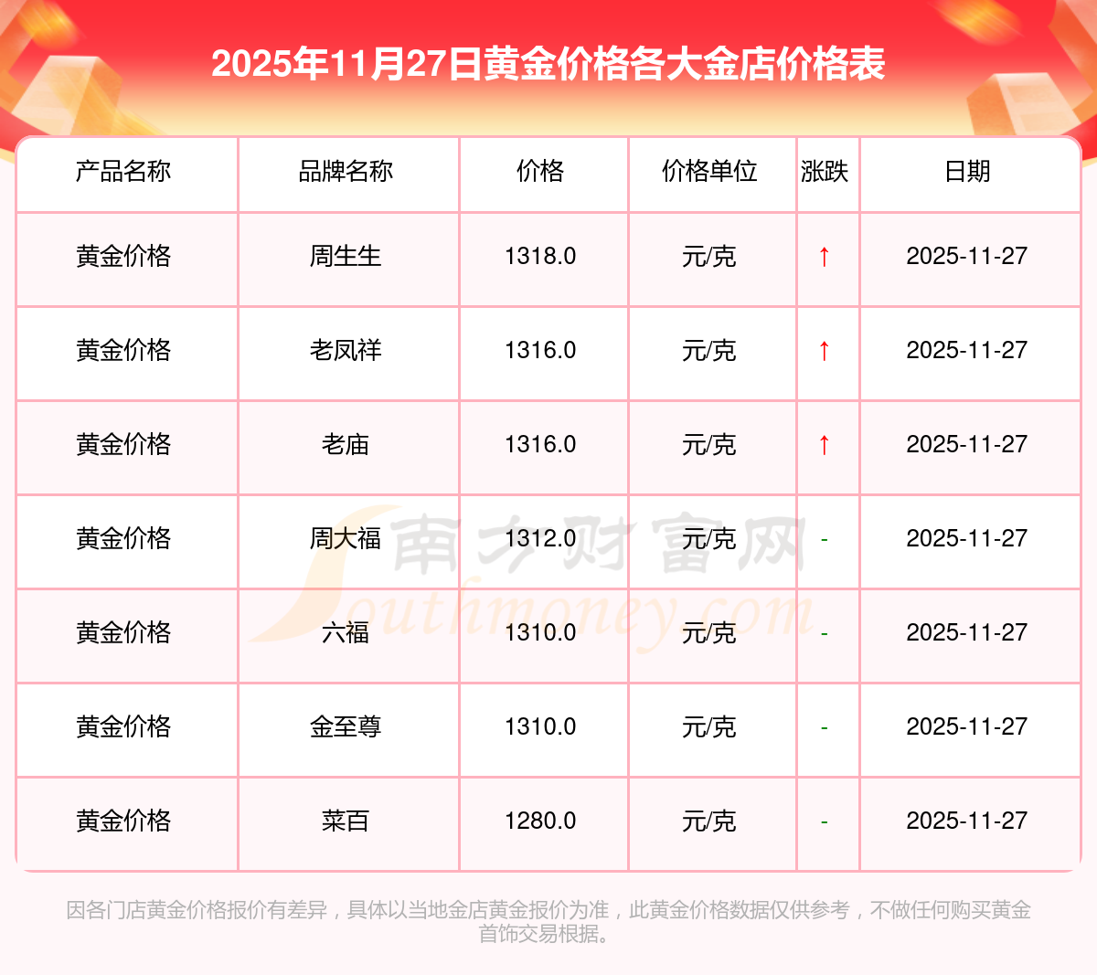 今天是2025年11月27日,周大福、周大福、老鳳祥、老鳳祥、六福、六福、六福、菜百、菜百、老廟、老廟等各大金店品牌黃金價格最新價格如下:周大福1312.0元/克、周大福652.0元/克、老鳳祥1316.0元/克、老鳳祥600.0元/克、六福1310.0元/克、六福652.0元/克、六福18700.0、菜百1280.0元/克、菜百540.0元/克、老廟1316.0元/克、老廟600.0元/克。