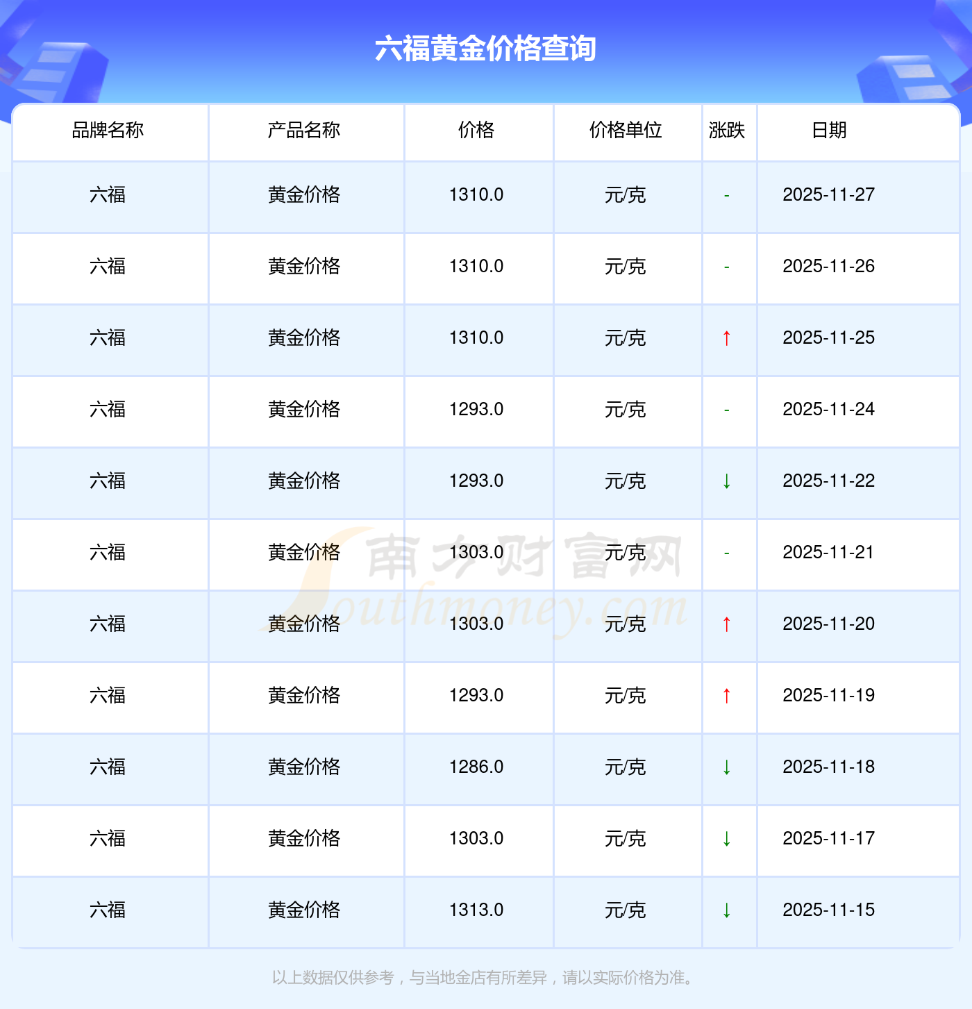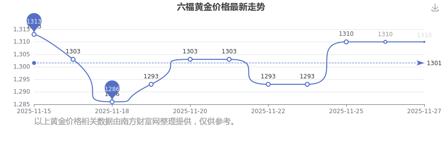 今日六福 黃金價(jià)格最新的克重售價(jià)為1310.0元/克。