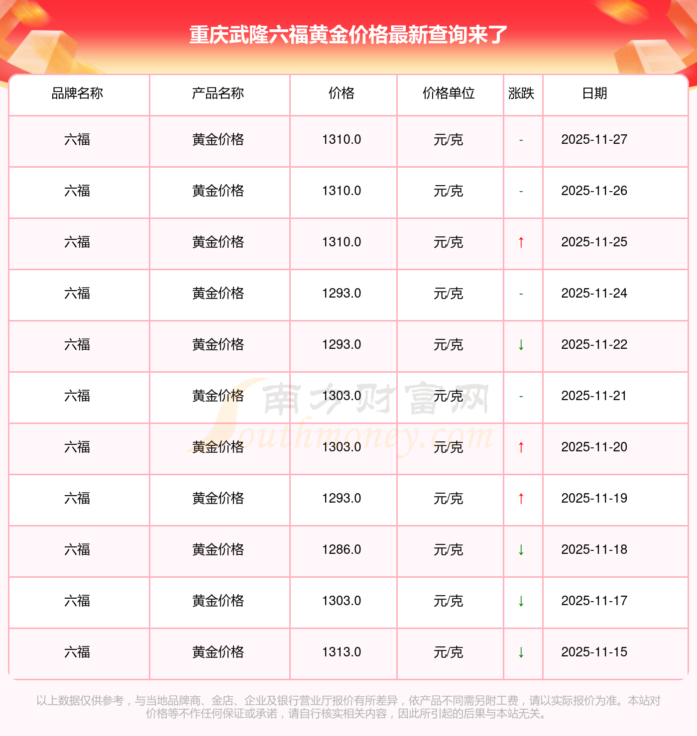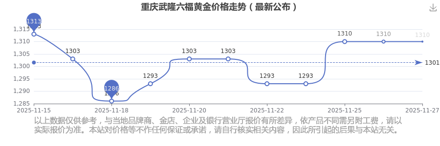 (2025年11月27日)重慶武隆六福黃金價(jià)格現(xiàn)在為1310.0元/克。