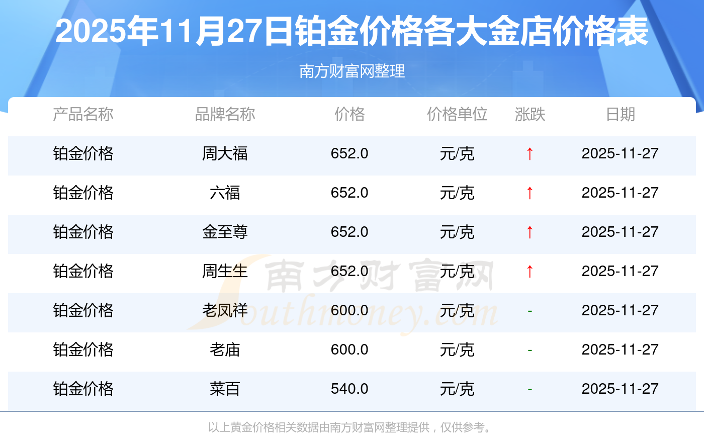 2025年11月27日,周大福、周大福、老鳳祥、老鳳祥、六福、六福、六福、菜百、菜百、老廟、老廟等各大金店品牌鉑金價格今日價格如下:周大福1312.0元/克、周大福652.0元/克、老鳳祥1316.0元/克、老鳳祥600.0元/克、六福1310.0元/克、六福652.0元/克、六福18700.0、菜百1280.0元/克、菜百540.0元/克、老廟1316.0元/克、老廟600.0元/克。
