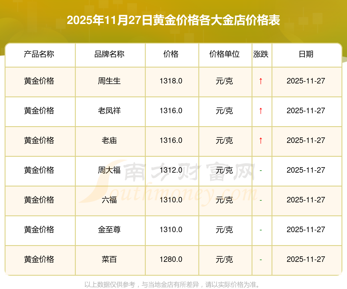 2025年11月27日,周大福、周大福、老鳳祥、老鳳祥、六福、六福、六福、菜百、菜百、老廟、老廟等各大金店品牌黃金價(jià)格今日價(jià)格如下:周大福1312.0元/克、周大福652.0元/克、老鳳祥1316.0元/克、老鳳祥600.0元/克、六福1310.0元/克、六福652.0元/克、六福18700.0、菜百1280.0元/克、菜百540.0元/克、老廟1316.0元/克、老廟600.0元/克。