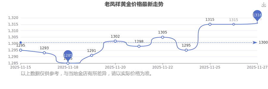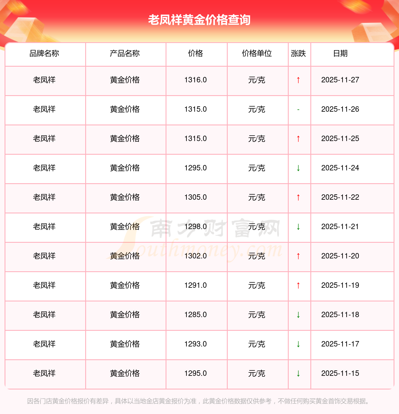 今日黃金價(jià)格查詢_現(xiàn)在金價(jià)黃金一克多少錢,黃金價(jià)格是多少錢一克?黃金是一種優(yōu)良的導(dǎo)電導(dǎo)熱材料,具有良好的導(dǎo)熱特性。黃金常用于電子工業(yè)中的特殊電路設(shè)計(jì),因其化學(xué)穩(wěn)定性高、抗氧化性強(qiáng),可制作高精度電子元件。2025年11月27日老鳳祥黃金價(jià)格查詢:1316.0元/克。