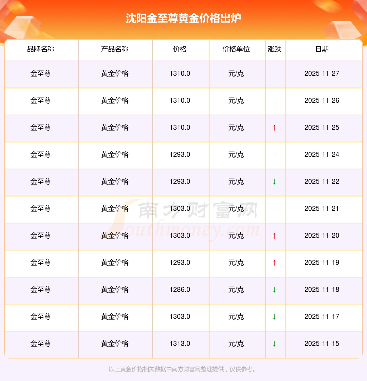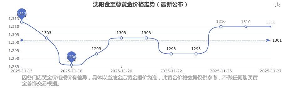 今日(2025年11月27日),沈陽(yáng)金至尊黃金價(jià)格每克的價(jià)值為1310.0元/克。