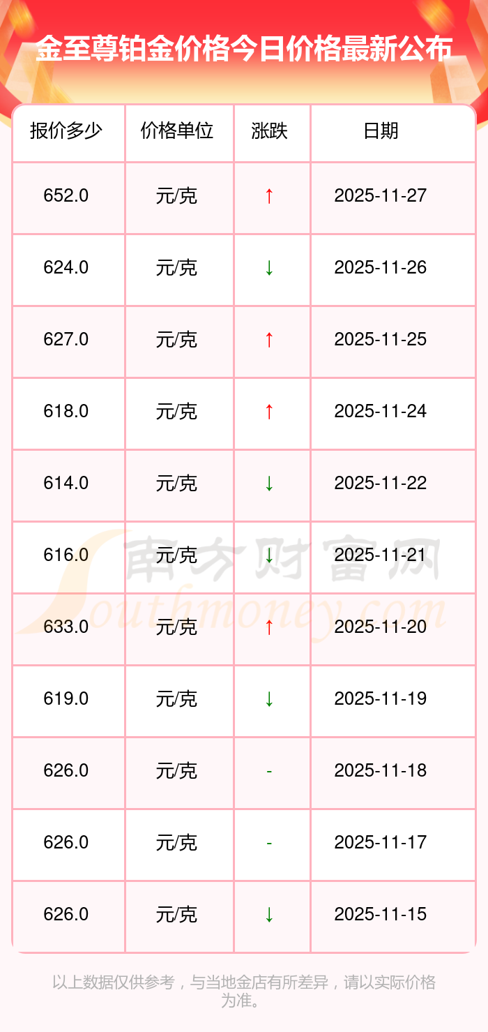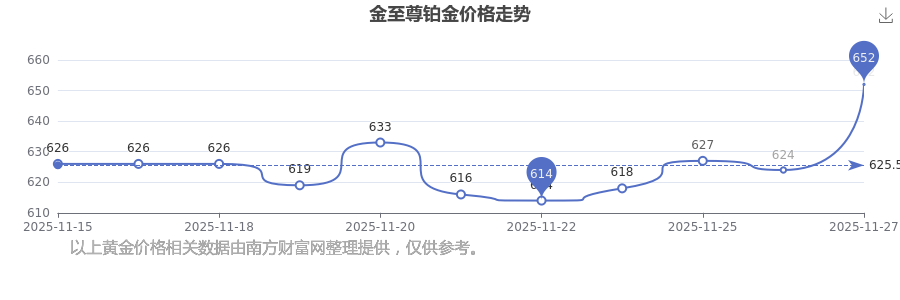 今日(2025年11月27日),金至尊鉑金價格:652.0元/克。