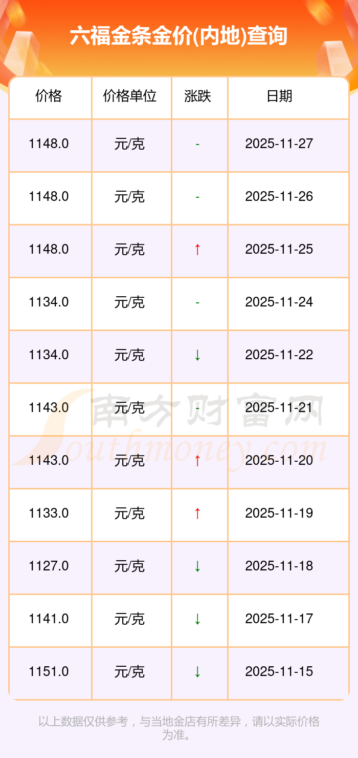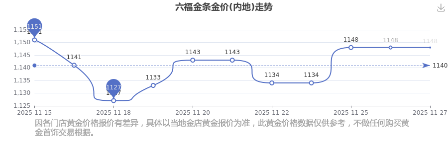 2025年11月27日六福金條金價(內(nèi)地)最新為1148.0元/克。