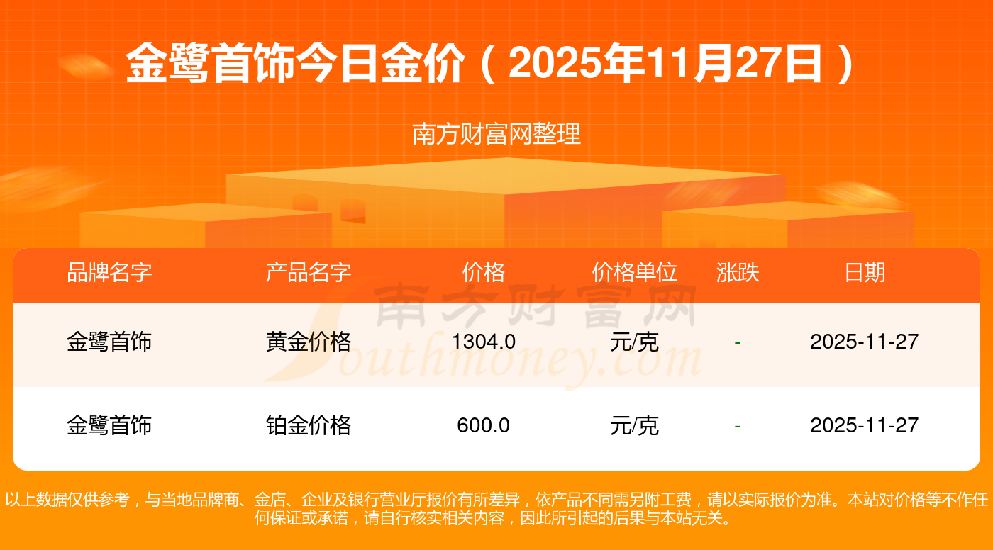 2025年11月27日周大福、周大福、老鳳祥、老鳳祥、六福、六福、六福、菜百、菜百、老廟、老廟等各大金店品牌黃金價(jià)格最新價(jià)格如下:周大福黃金價(jià)格1312.0元/克,周大福鉑金價(jià)格652.0元/克,老鳳祥黃金價(jià)格1316.0元/克,老鳳祥鉑金價(jià)格600.0元/克,六福黃金價(jià)格1310.0元/克,六福鉑金價(jià)格652.0元/克,六福鉑金價(jià)格(香港)18700.0,菜百黃金價(jià)格1280.0元/克,菜百鉑金價(jià)格540.0元/克,老廟黃金價(jià)格1316.0元/克,老廟鉑金價(jià)格600.0元/克。