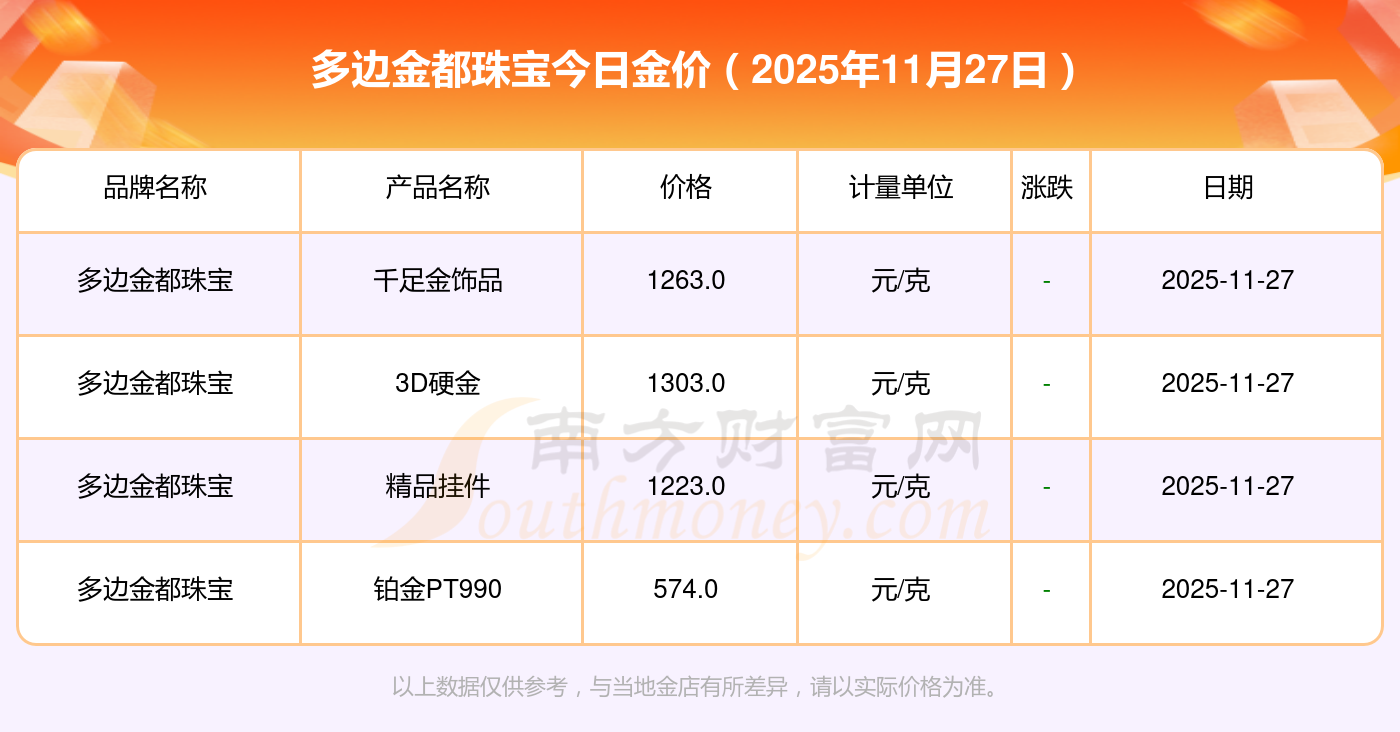 2025年11月27日多邊金都珠寶最新價格:黃金價格1312.0元/克,鉑金價格652.0元/克,黃金價格1316.0元/克,鉑金價格600.0元/克,黃金價格1310.0元/克,鉑金價格652.0元/克,鉑金價格(香港)18700.0,黃金價格1280.0元/克,鉑金價格540.0元/克,黃金價格1316.0元/克,鉑金價格600.0元/克。