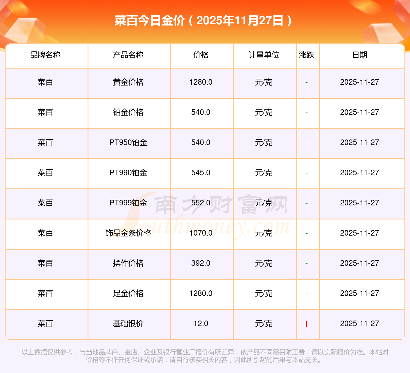 以上數(shù)據(jù)僅供參考,與當(dāng)?shù)亟鸬暧兴町,?qǐng)以實(shí)際價(jià)格為準(zhǔn)。
