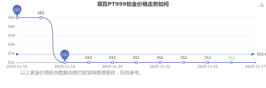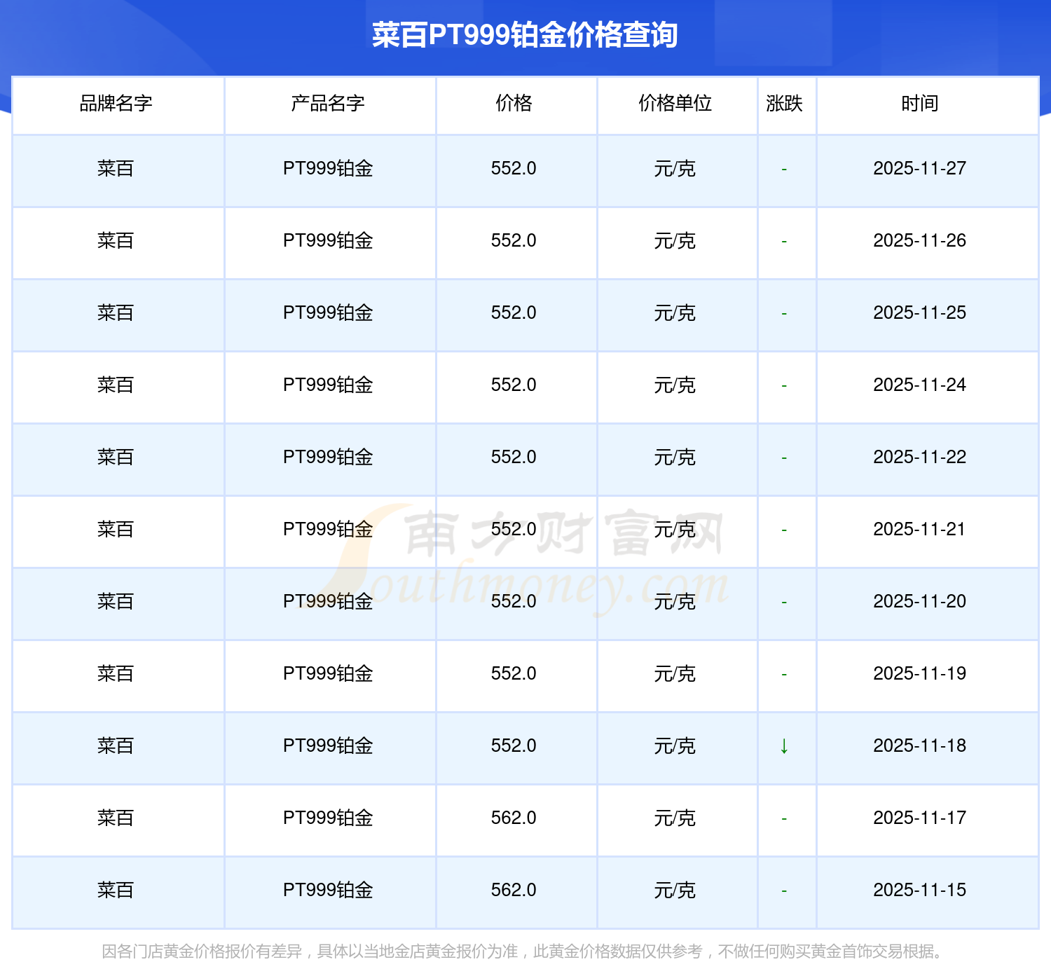 今日菜百 PT999鉑金的最新定價為552.0元/克。