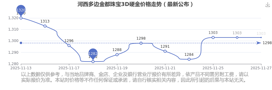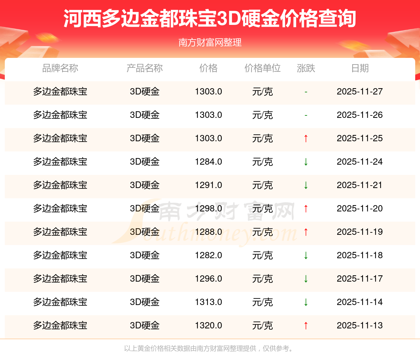 于 2025年11月27日,河西多邊金都珠寶3D硬金的克價為1303.0元/克。