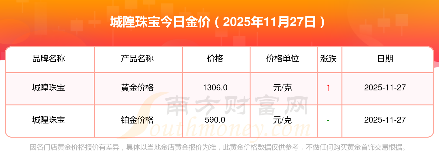 2025年11月27日各大金店黃金價(jià)格最新價(jià)格:周大福1312.0元/克,周大福652.0元/克,老鳳祥1316.0元/克,老鳳祥600.0元/克,六福1310.0元/克,六福652.0元/克,六福18700.0,菜百1280.0元/克,菜百540.0元/克,老廟1316.0元/克,老廟600.0元/克。