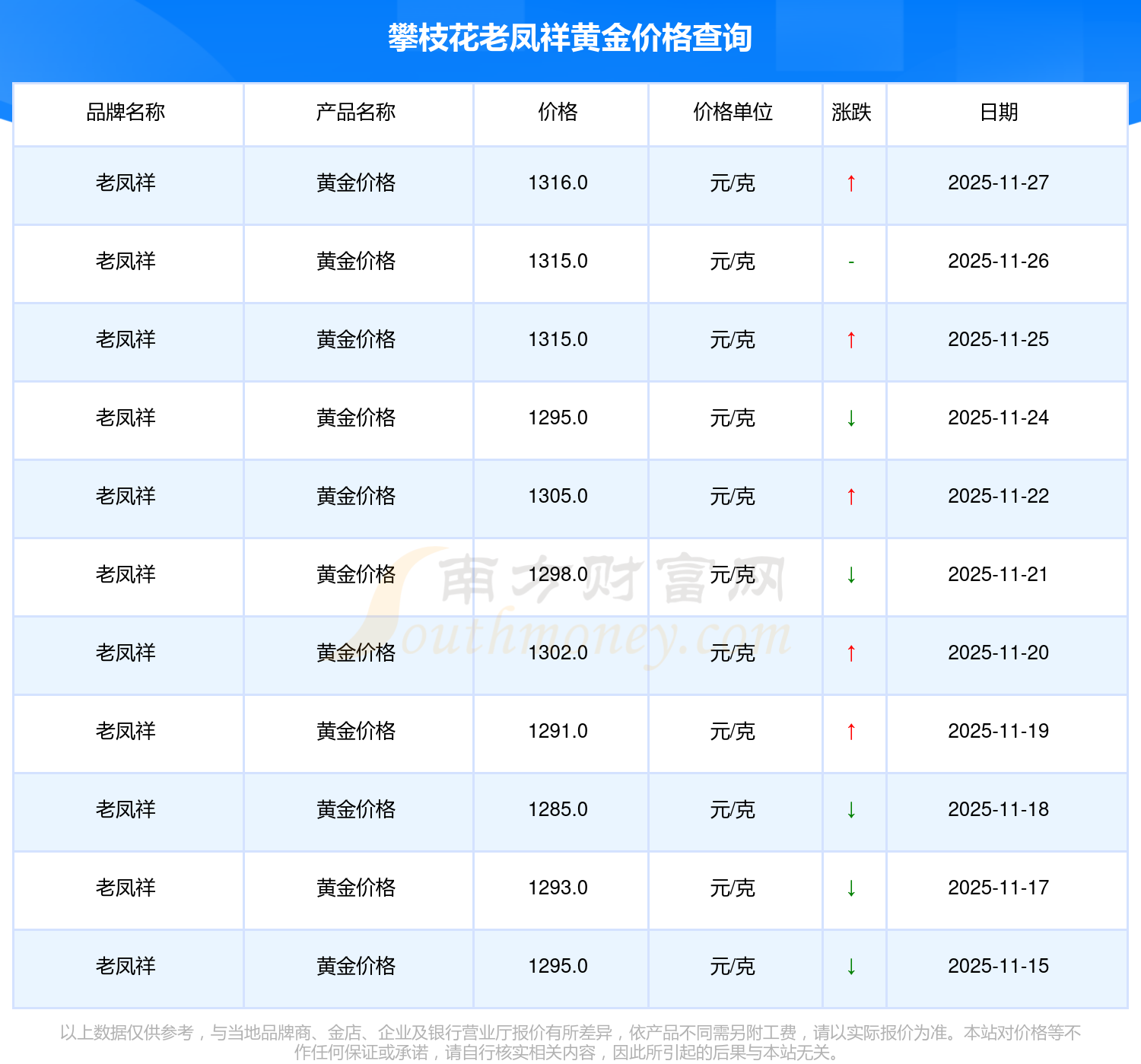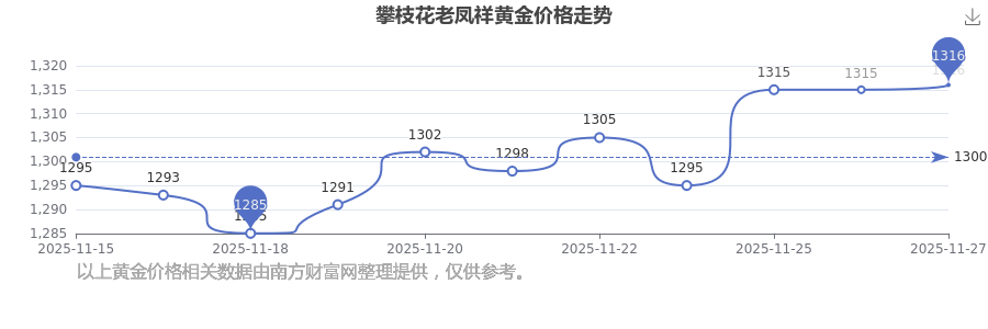 今日(2025年11月27日)攀枝花老鳳祥黃金價(jià)格最新價(jià)格為1316.0元/克。