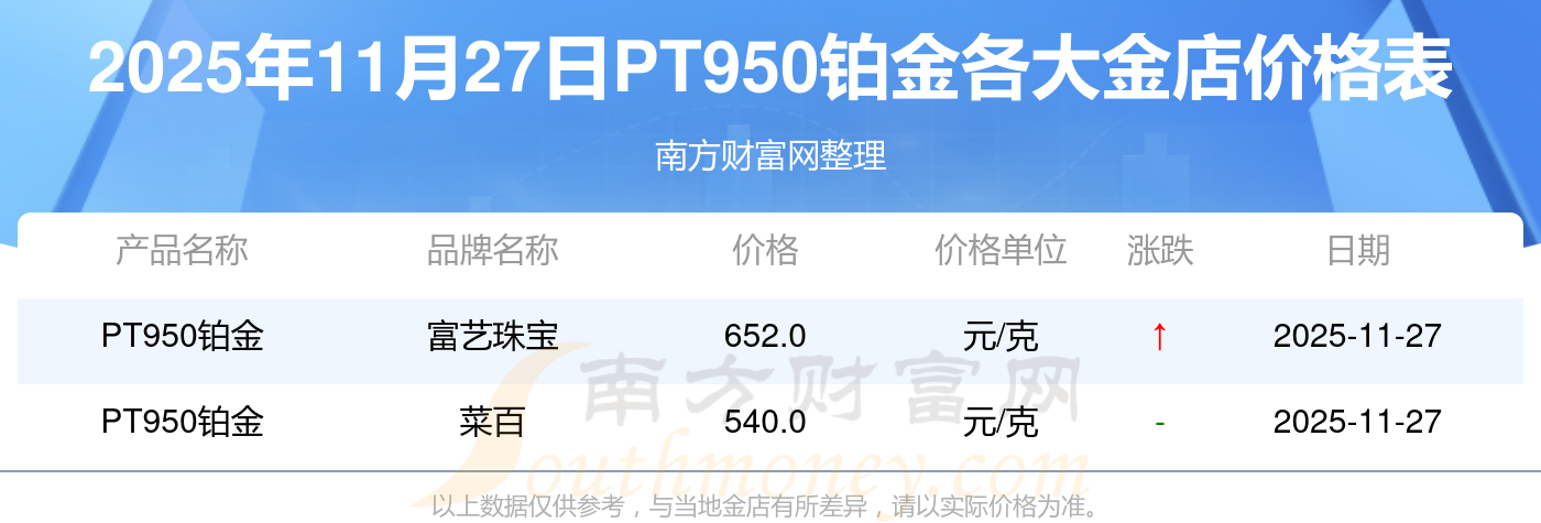 2025年11月27日,周大福、周大福、老鳳祥、老鳳祥、六福、六福、六福、菜百、菜百、老廟、老廟等各大金店品牌PT950鉑金今日價格如下:周大福1312.0元/克、周大福652.0元/克、老鳳祥1316.0元/克、老鳳祥600.0元/克、六福1310.0元/克、六福652.0元/克、六福18700.0、菜百1280.0元/克、菜百540.0元/克、老廟1316.0元/克、老廟600.0元/克。