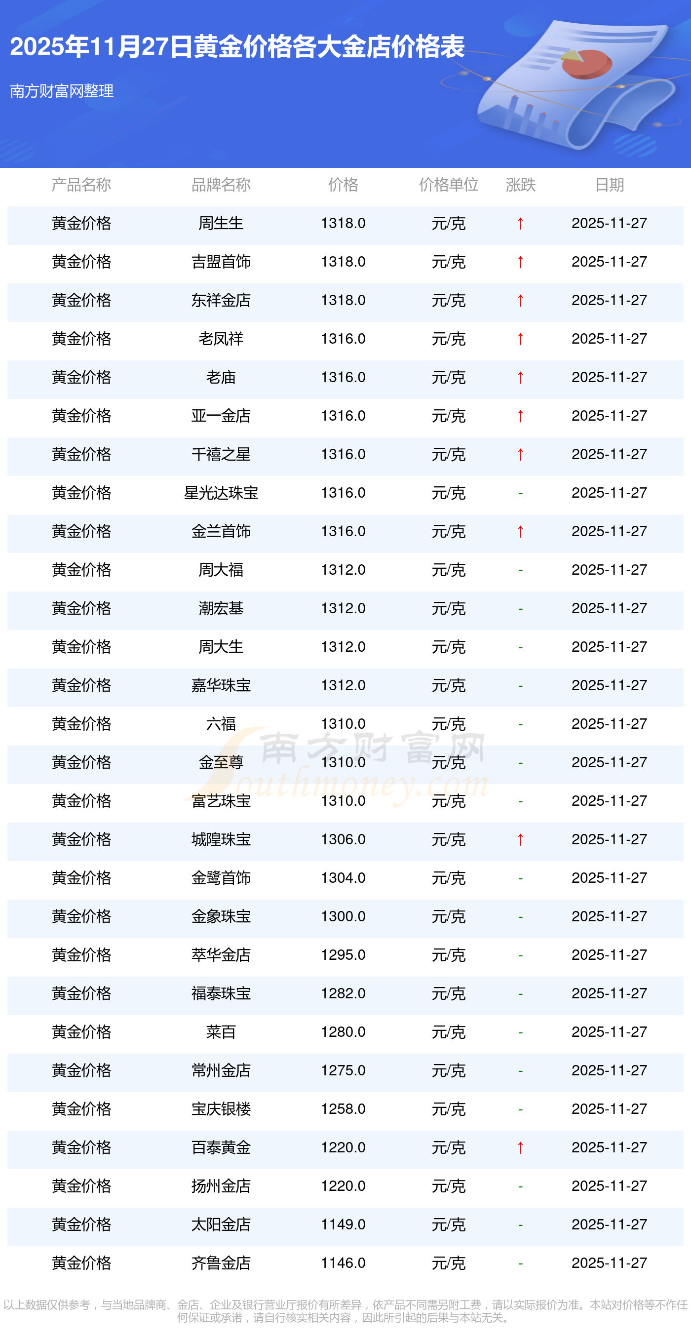 2025年11月27日周大福、周大福、老鳳祥、老鳳祥、六福、六福、六福、菜百、菜百、老廟、老廟等各大金店品牌黃金價(jià)格最新價(jià)格如下:周大福黃金價(jià)格1312.0元/克,周大福鉑金價(jià)格652.0元/克,老鳳祥黃金價(jià)格1316.0元/克,老鳳祥鉑金價(jià)格600.0元/克,六福黃金價(jià)格1310.0元/克,六福鉑金價(jià)格652.0元/克,六福鉑金價(jià)格(香港)18700.0,菜百黃金價(jià)格1280.0元/克,菜百鉑金價(jià)格540.0元/克,老廟黃金價(jià)格1316.0元/克,老廟鉑金價(jià)格600.0元/克。