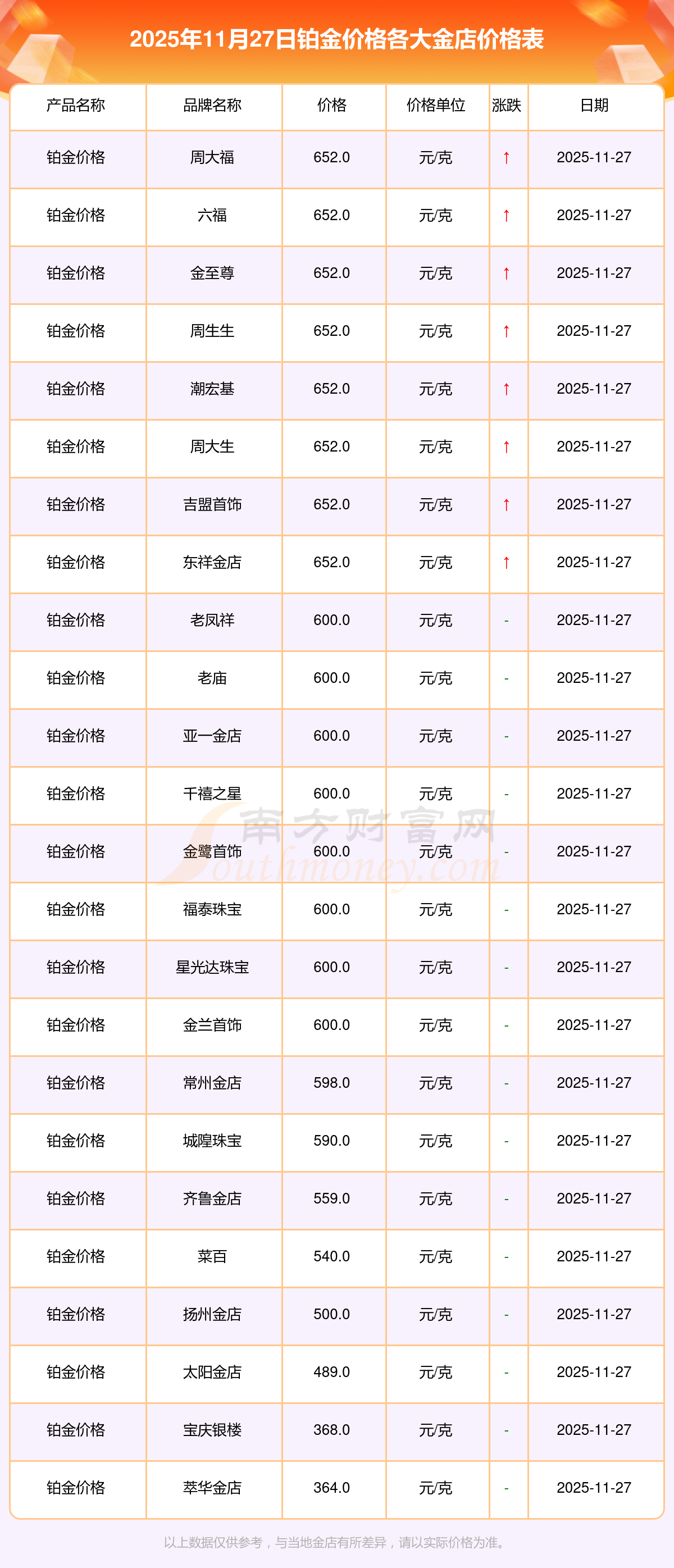 2025年11月27日,周大福、周大福、老鳳祥、老鳳祥、六福、六福、六福、菜百、菜百、老廟、老廟等各大金店品牌鉑金價(jià)格今日價(jià)格如下:周大福1312.0元/克、周大福652.0元/克、老鳳祥1316.0元/克、老鳳祥600.0元/克、六福1310.0元/克、六福652.0元/克、六福18700.0、菜百1280.0元/克、菜百540.0元/克、老廟1316.0元/克、老廟600.0元/克。